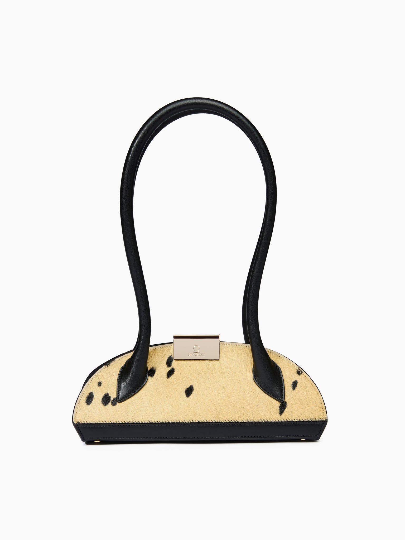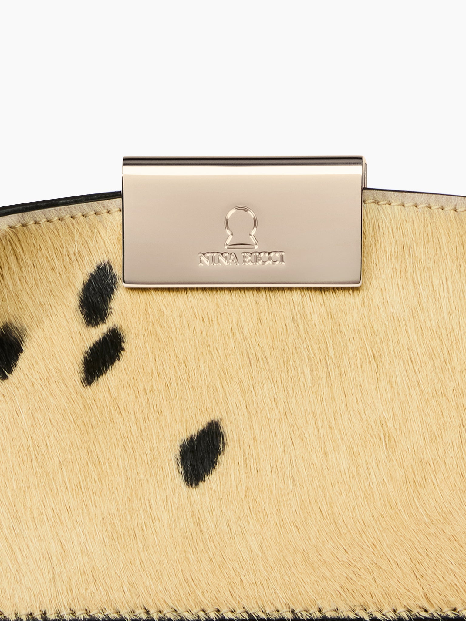 The Le Bal Bag Mini asserts its character in a miniature format with a bold style. Crafted in a mix of smooth black leather and animal-print leather, with a velvet-like leather lining, this model closes with a gold magnetic flap clasp.
