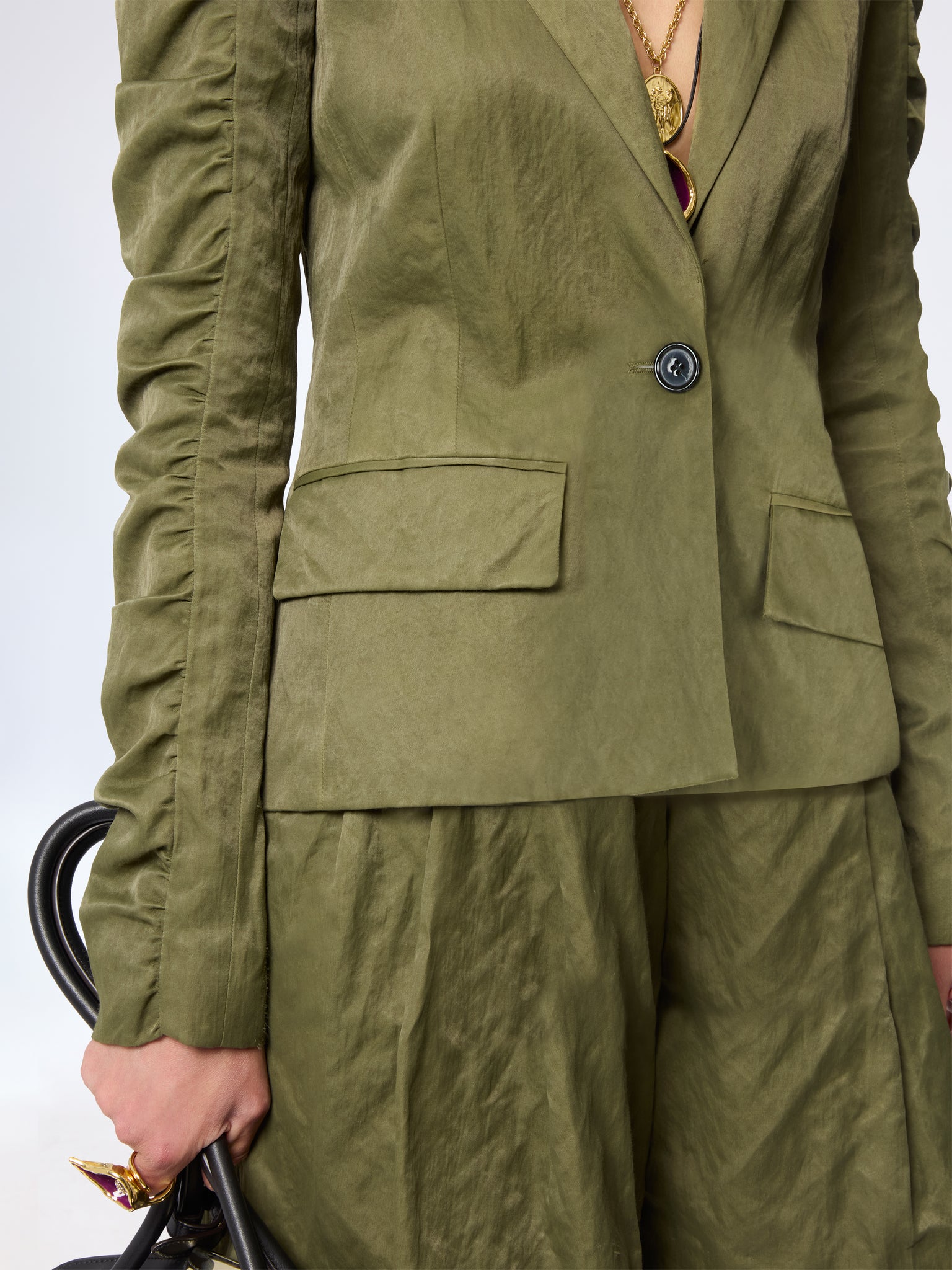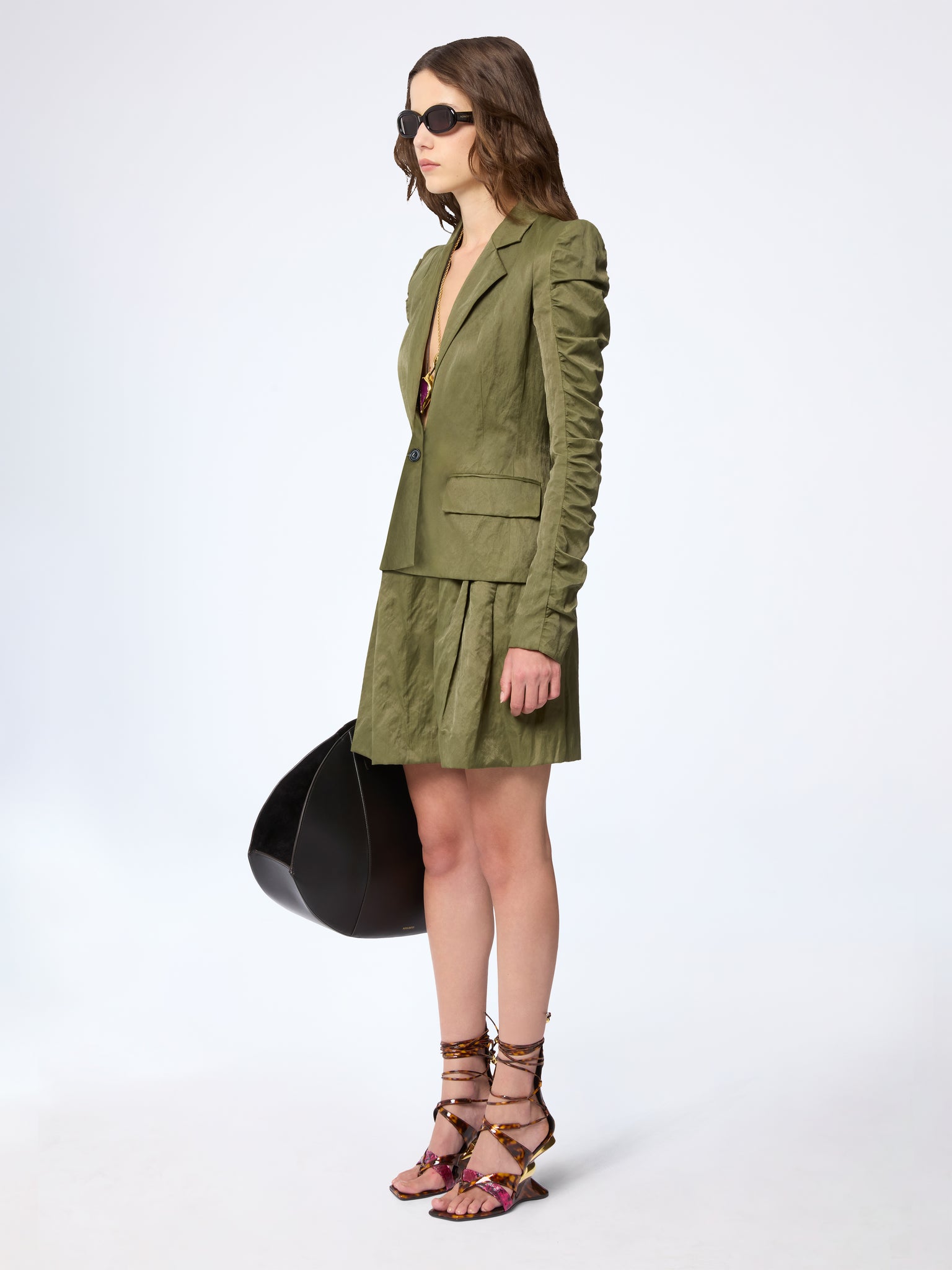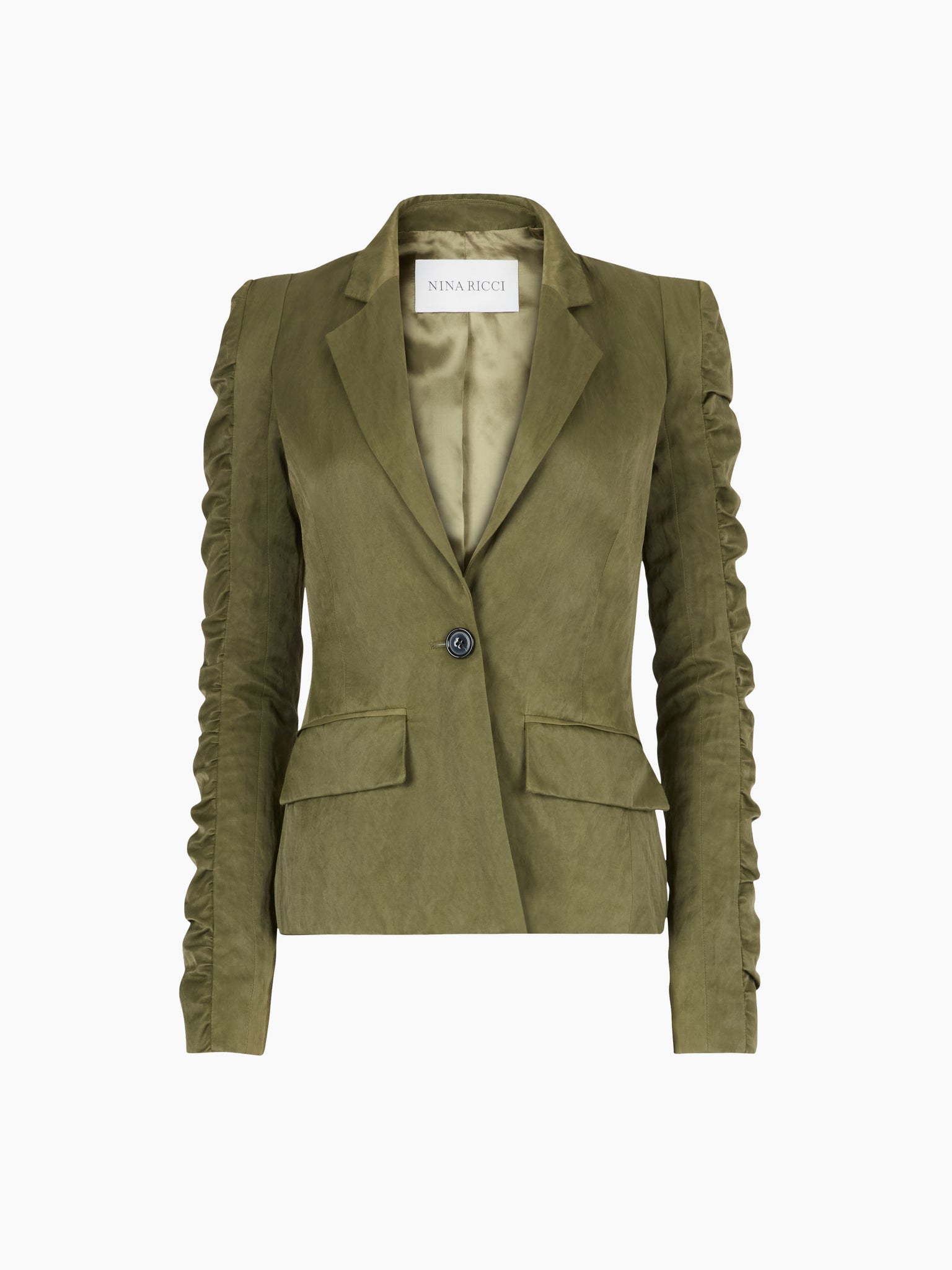 Cut in crinkled cotton, this tailored jacket brings a textured dimension to the Spring-Summer 2026 collection. Its fitted silhouette is animated by softly ruched sleeves, creating a subtle play on movement and structure.