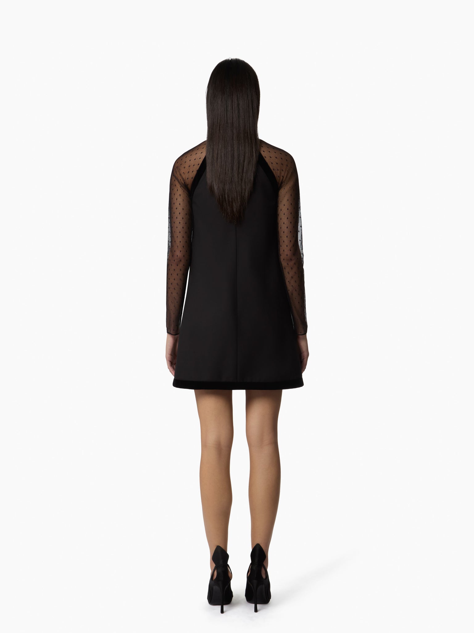 This black wool gabardine mini dress embodies the couture spirit dear to Maison Nina Ricci. It stands out with long sheer polka-dot tulle sleeves and black velvet finishes, including a lavallière bow that enhances the neckline. Piped pockets and a defined hemline reinforce the dress’s graphic silhouette. A bold piece designed for evening elegance with a romantic and assertive flair.