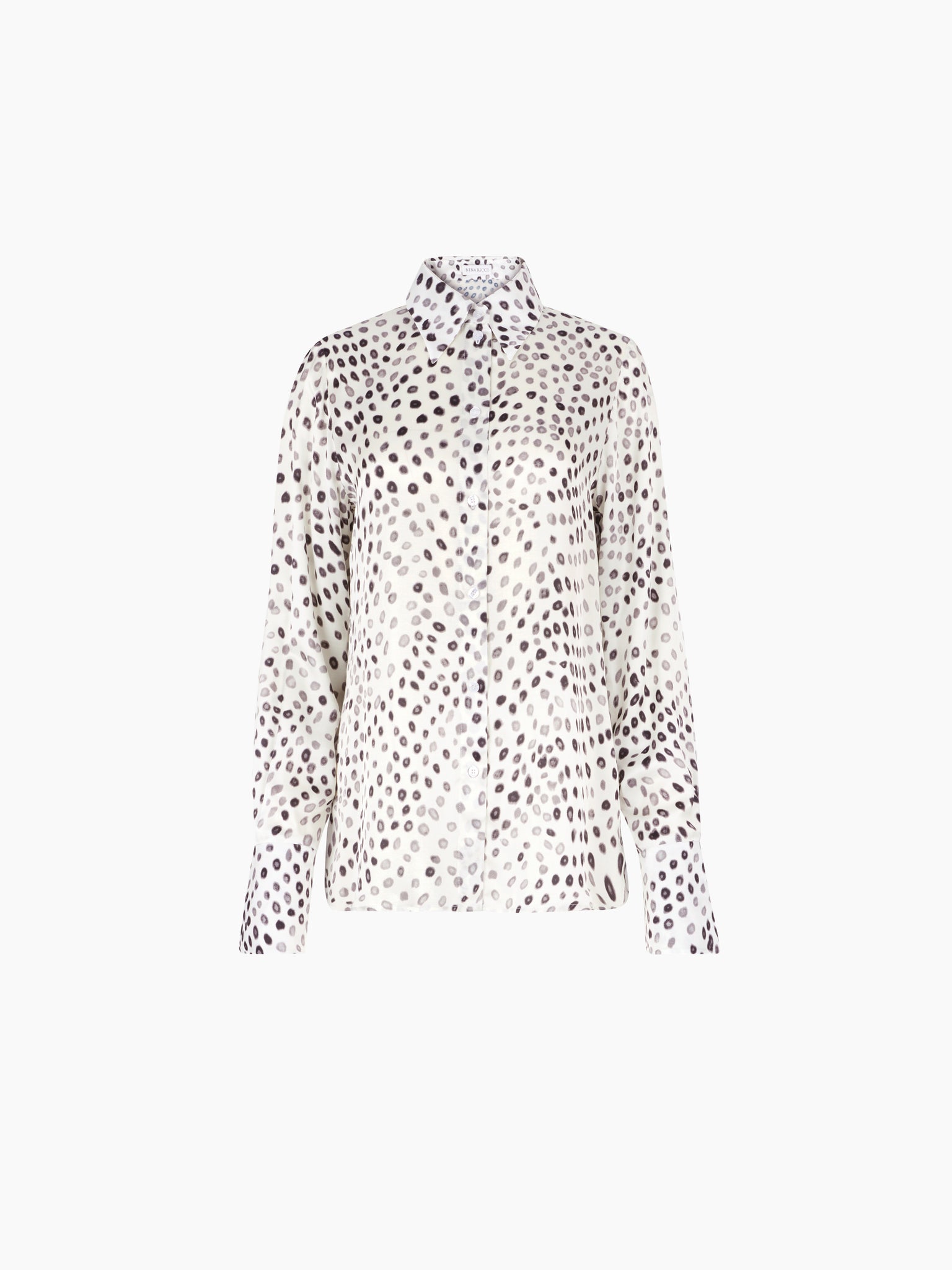 Lightweight and fluid, this satin shirt revisits the polka dot with a playful elegance. Its softly structured cut is finished with flared cuffs that bring movement and drama to the silhouette. Worn tucked into tailoring or left loose, it captures the spirit of Nina Ricci's Spring-Summer 2026 collection—classic with a twist.