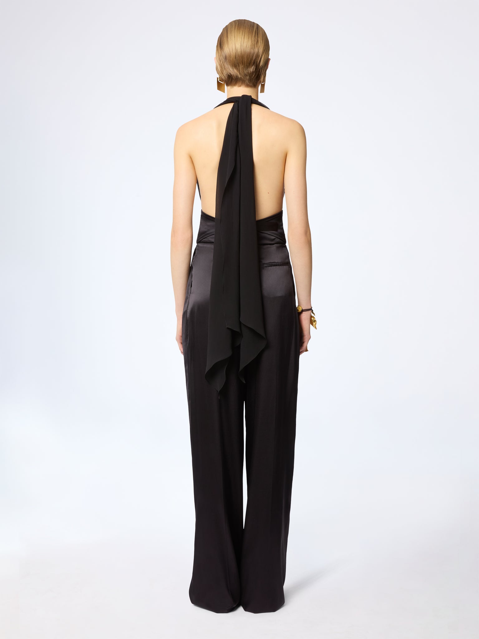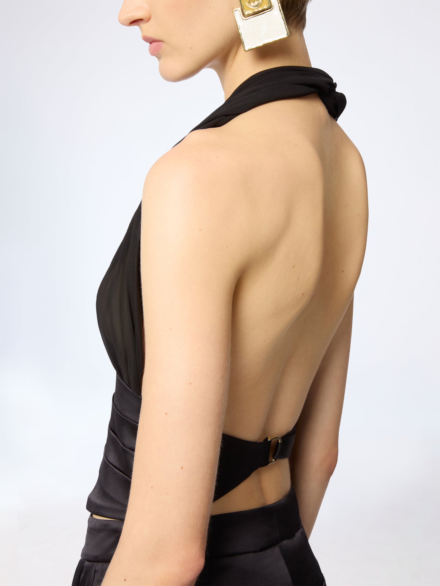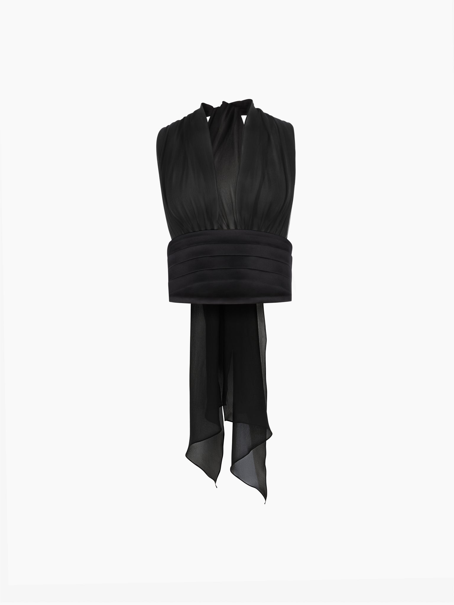 This silk halter blouse from the Spring-Summer 2026 collection features a deep V neckline and a bow tie for an elevated evening look.