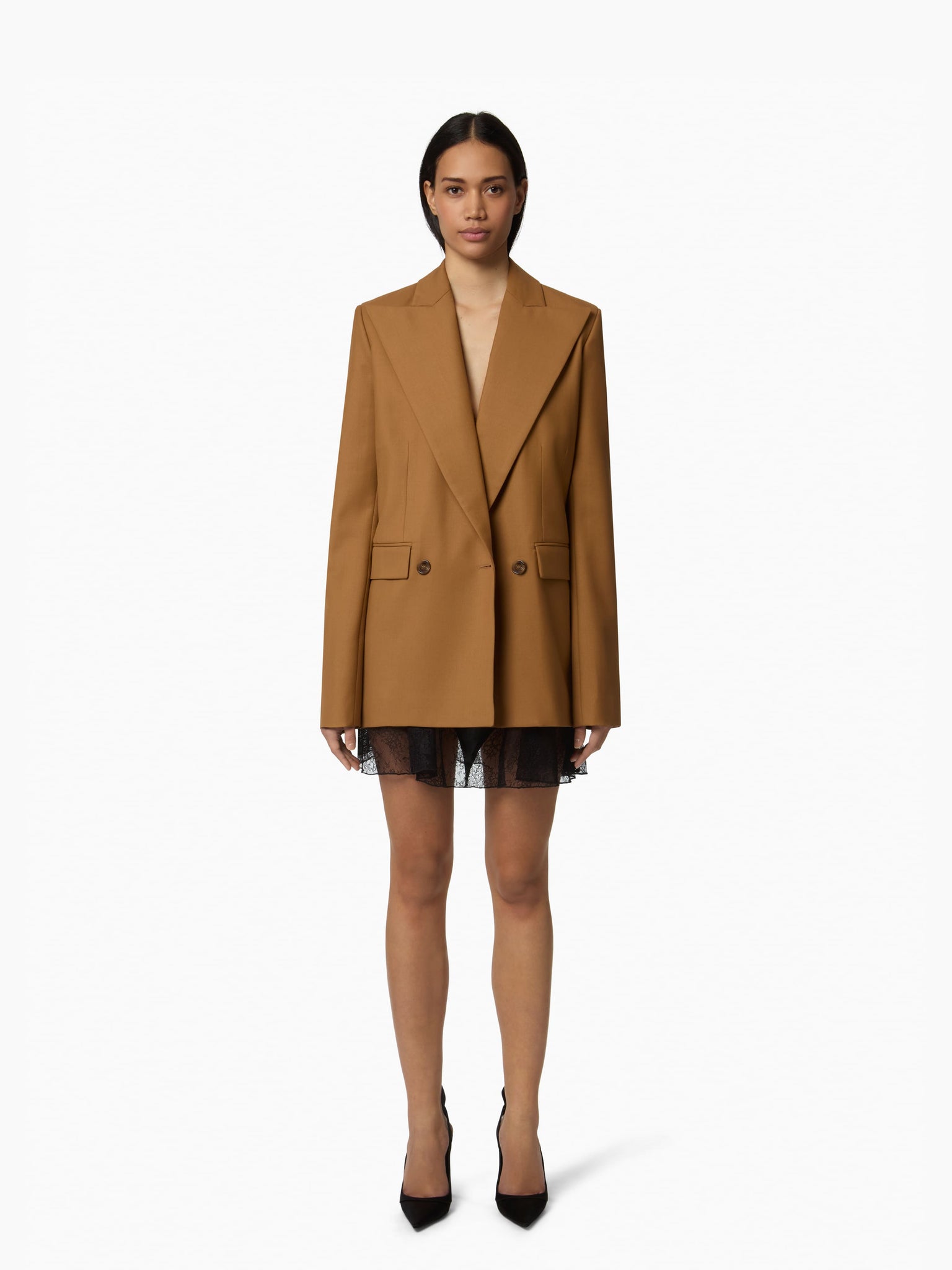 This double-breasted blazer in tobacco brown captures the sharp precision of tailoring as envisioned by Nina Ricci. Its oversized silhouette brings structure with understated elegance. Crafted in crisp wool gabardine, this standout piece from the Fall-Winter 2025 collection offers a modern interpretation of classic formalwear.