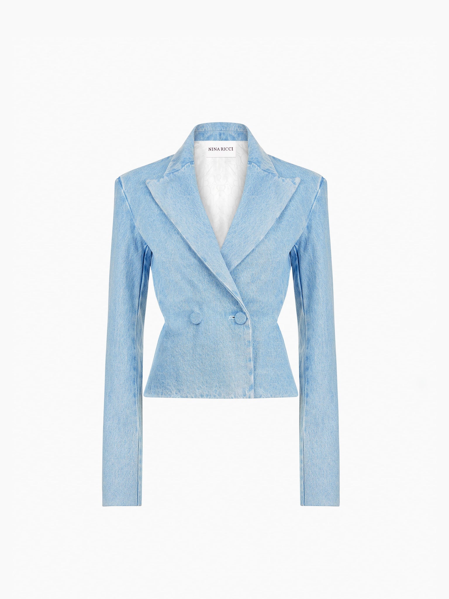 This double-breasted jacket, imagined by Harris Reed for the Fall-Winter 2025 collection, stands out with its open back and bold tailoring. Crafted from light blue denim, it captivates with its oversized pointed collar, cinched waist, and couture finishes. Its structured, modern silhouette reflects the unconventional elegance that defines the Nina Ricci universe. Worn with the matching skirt, it creates a confident full Nina Ricci look. For a more relaxed take, it pairs effortlessly with trousers or another skirt from the collection.