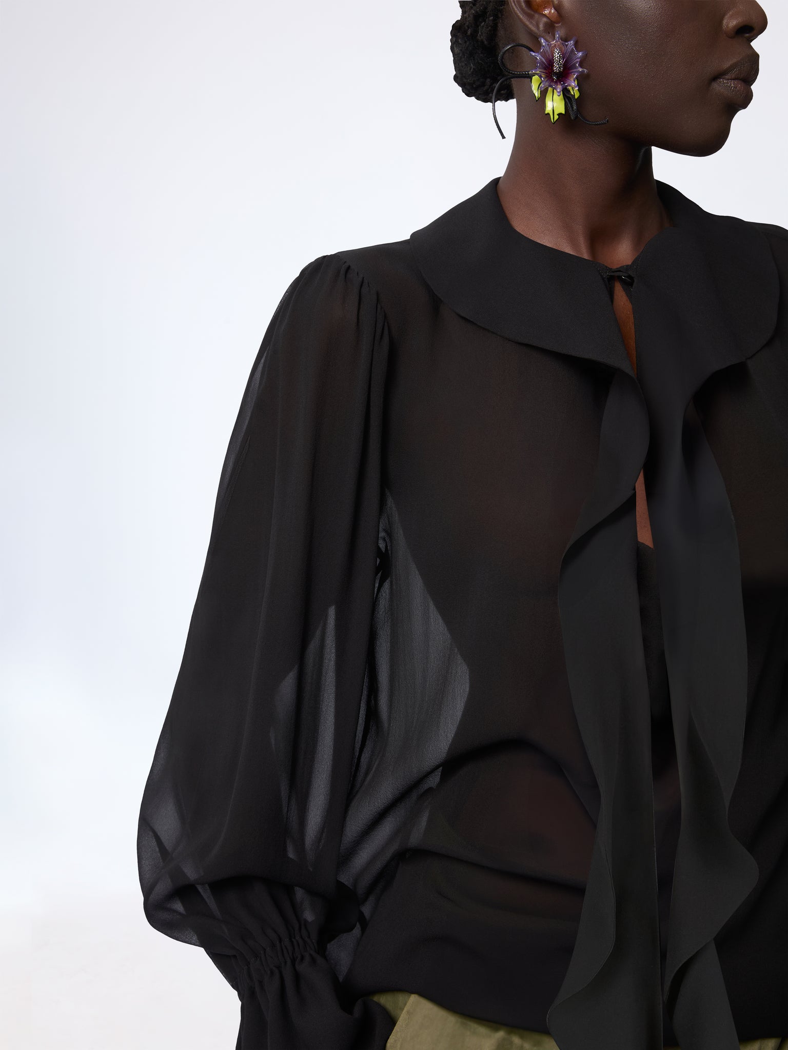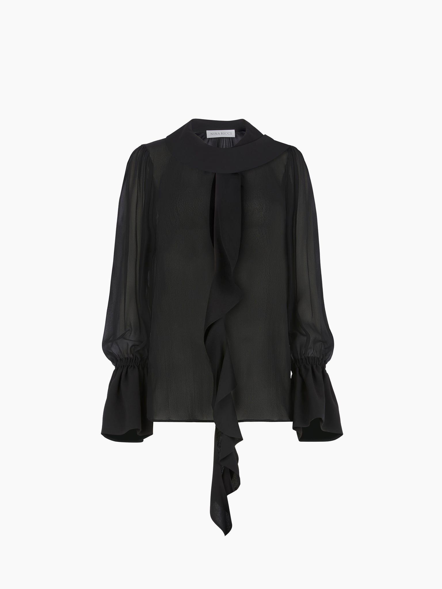 A signature of Nina Ricci’s heritage, the lavallière shirt returns for the Spring-Summer 2026 collection in sheer black silk. This reimagined version features soft gathers, balloon sleeves and a fluid bow collar, tying femininity with quiet drama. Timeless yet subversive, it captures the poetic sensuality at the heart of Harris Reed’s vision for the house.