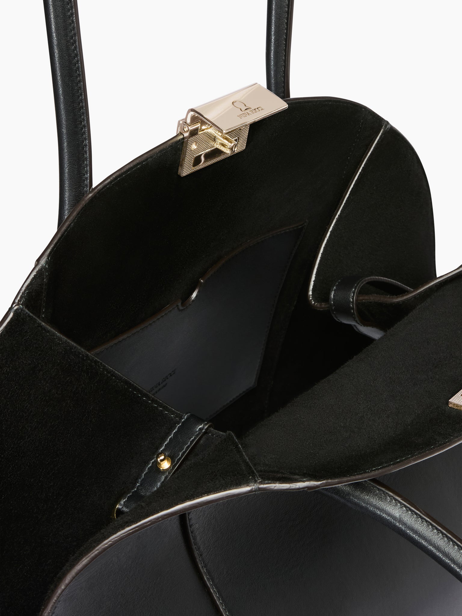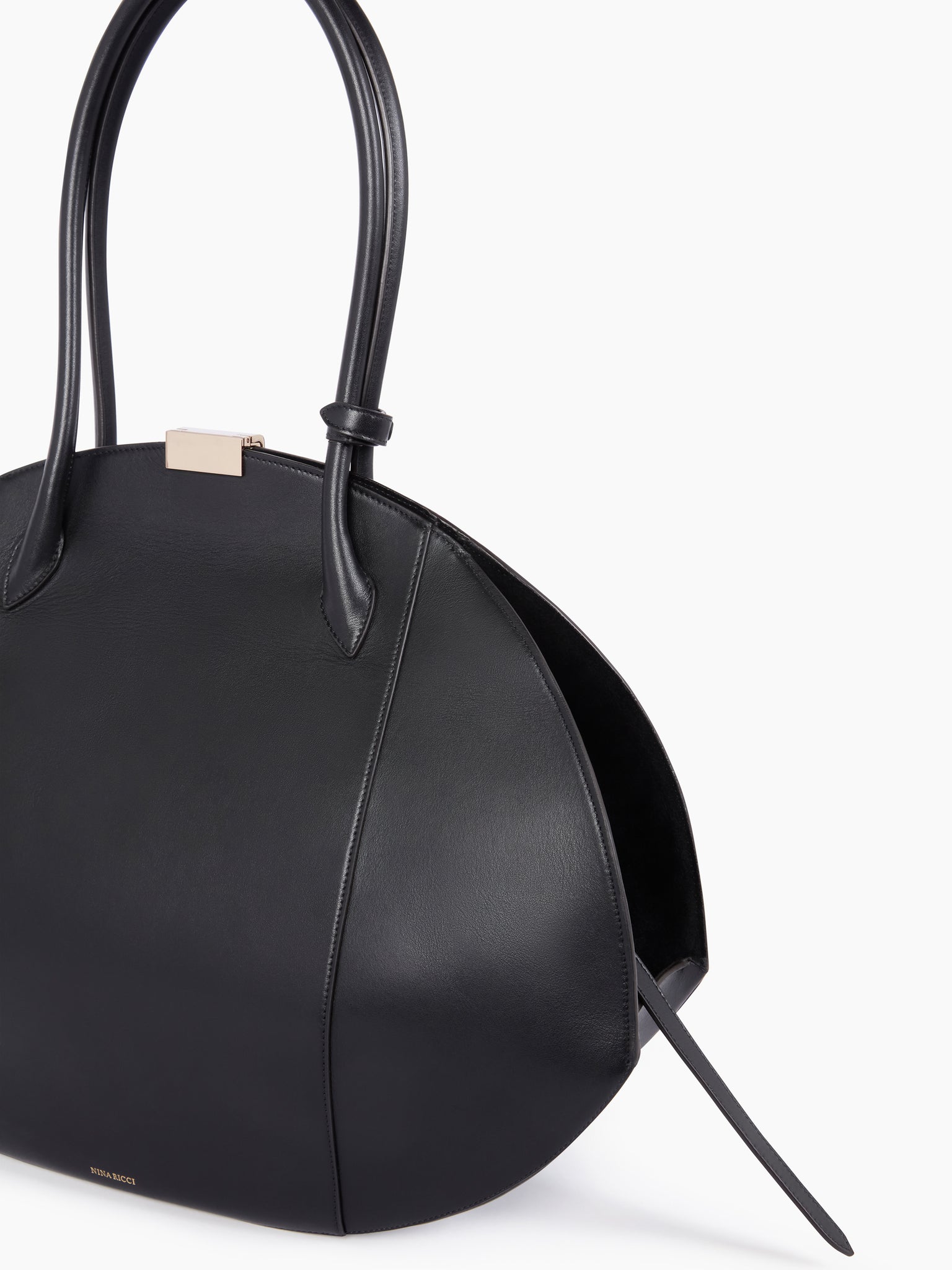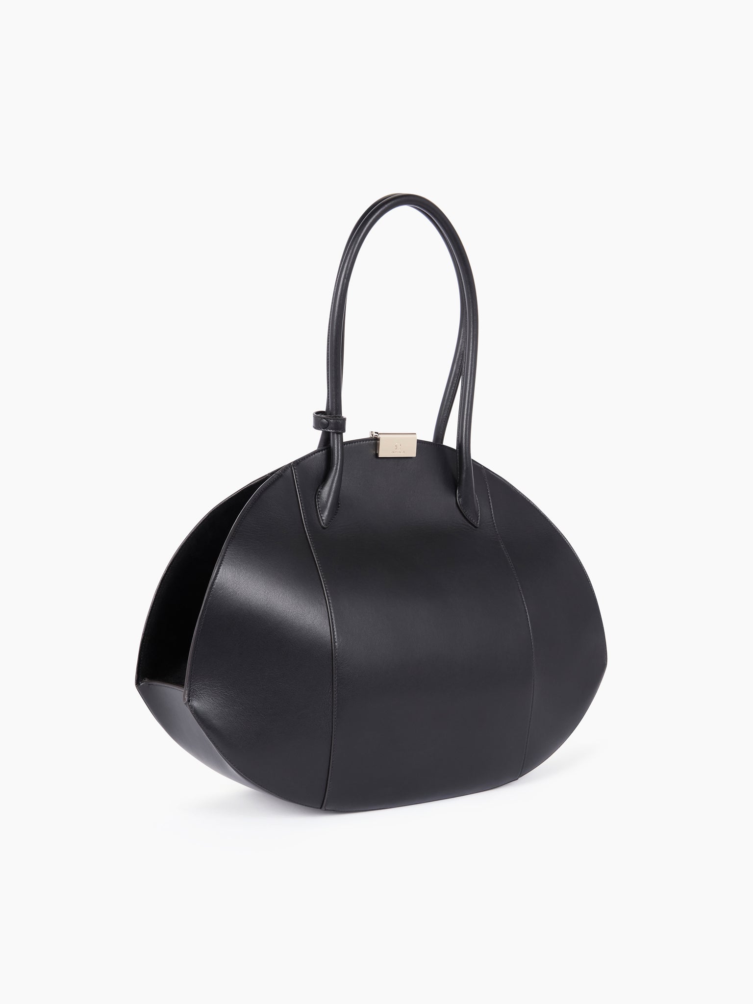 The Le Bal Bag Large extends the signature of the model in a large format, designed to hold the essentials and more, with a rounded and elongated silhouette whose elegant proportions make it a must-have. Crafted in smooth black calf leather with a velvet-like leather lining, it stands out with its timeless allure, enhanced by a gold magnetic flap clasp.