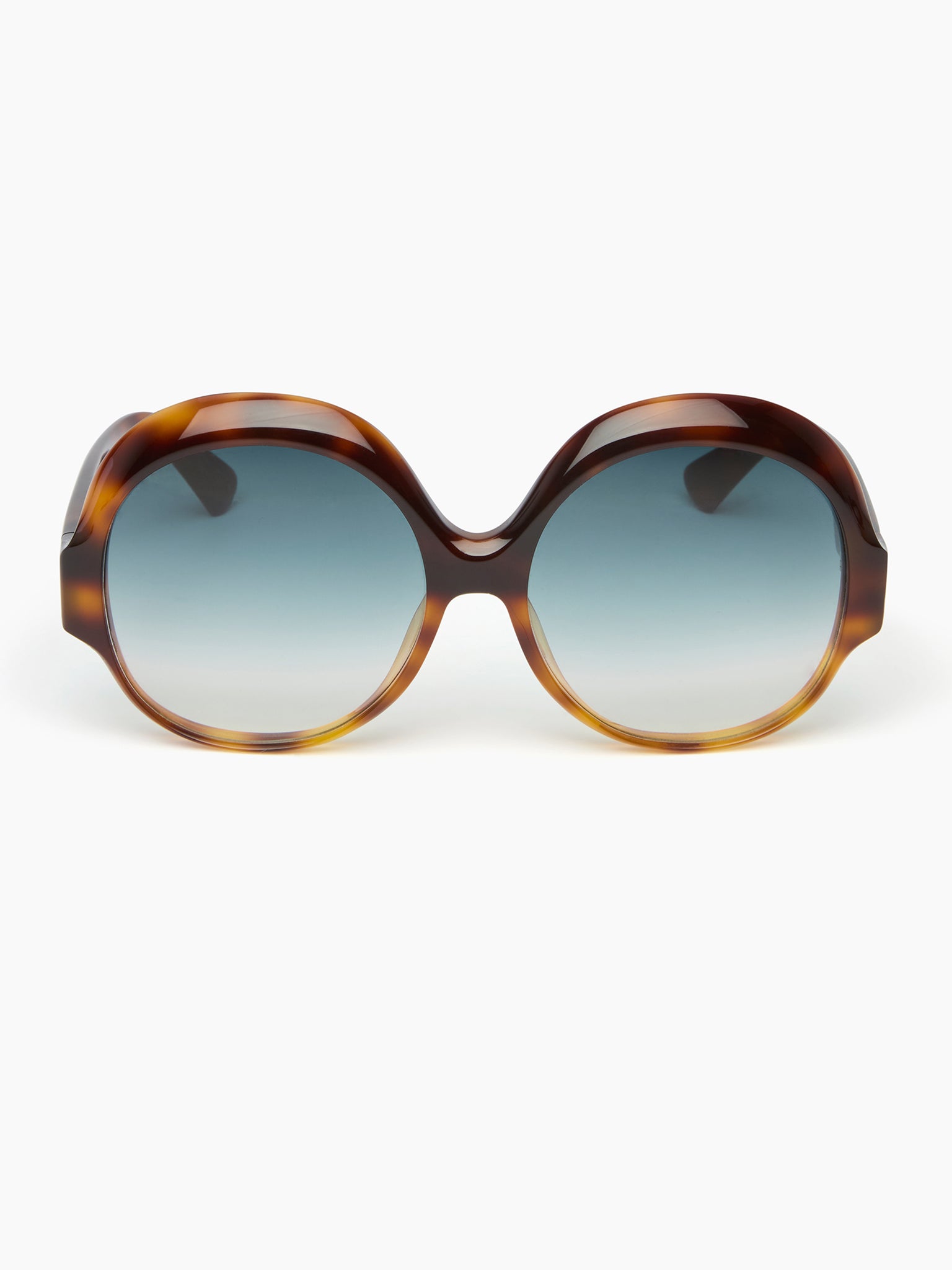 These oversized round acetate sunglasses capture the bold spirit of the 1970s while embracing a contemporary twist. Their voluminous silhouette is enhanced by temples featuring the iconic “wave” design, where sleek lines and sharp angles create a striking contrast. They embody a perfect balance between vintage inspiration and modern sophistication.