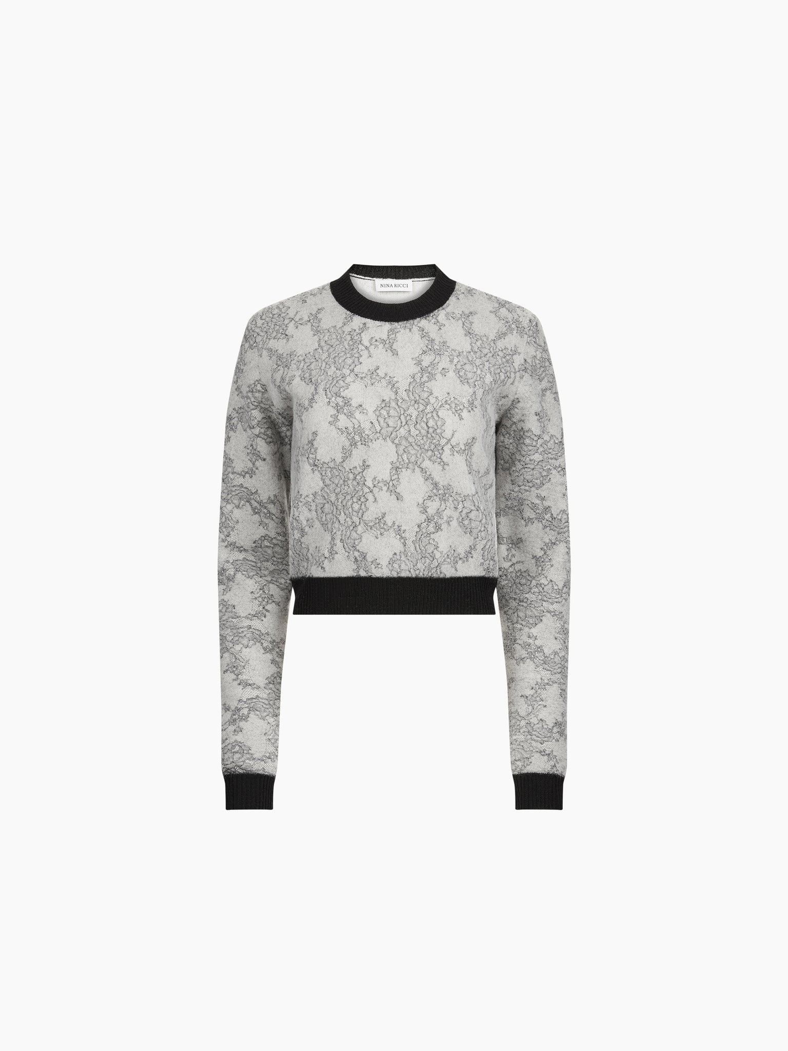This cream wool knit sweater features an all-over lace motif, making it a perfect mid-season piece that blends elegance and lightness. Crafted in felted wool jersey, it is adorned with black lace applied using a “punch needle” technique for added texture and refinement. The contrasting black ribbed edges at the collar, cuffs, and waistband bring structure to the silhouette. Paired with the matching skirt, it completes a signature Nina Ricci total look.