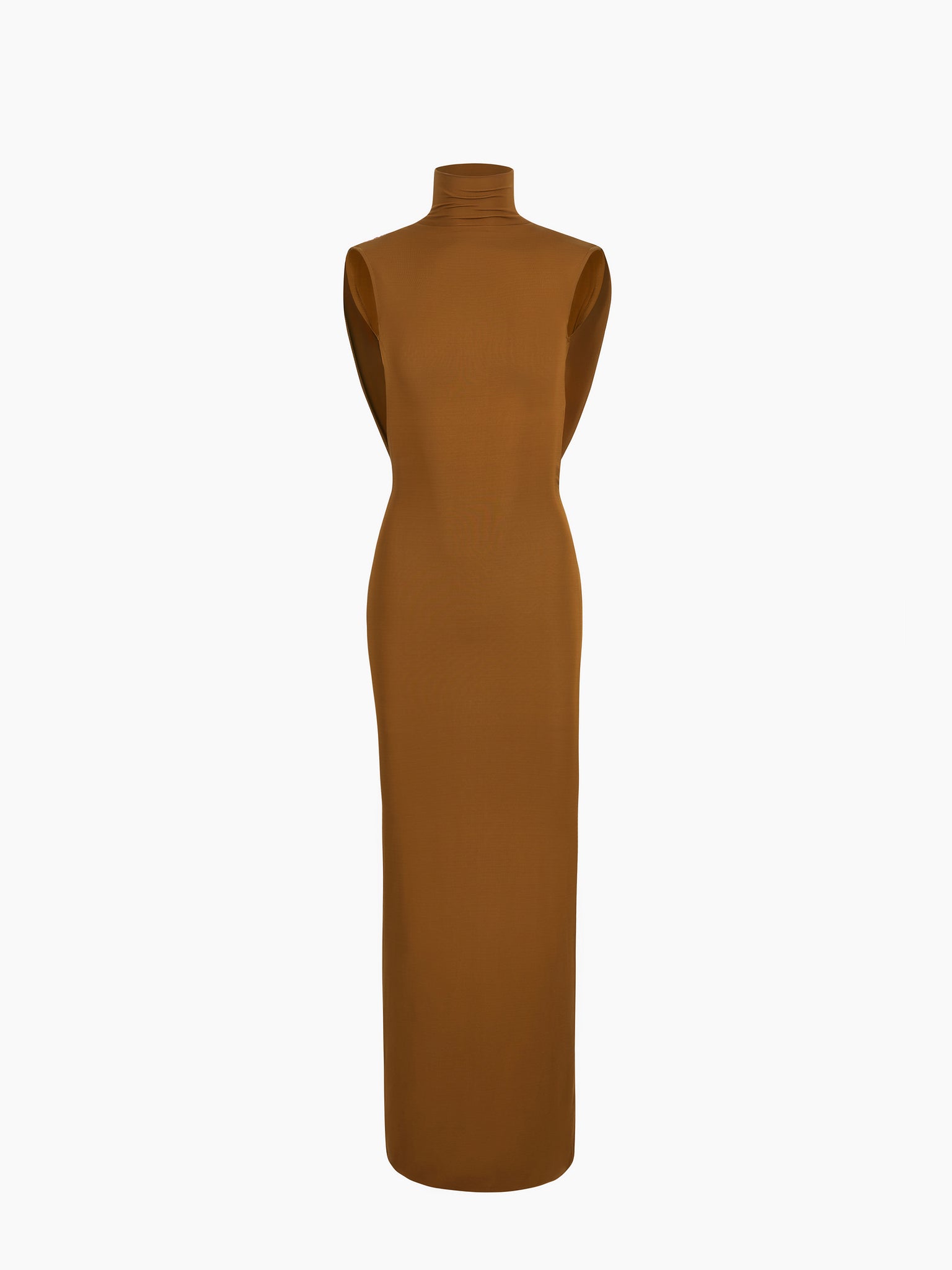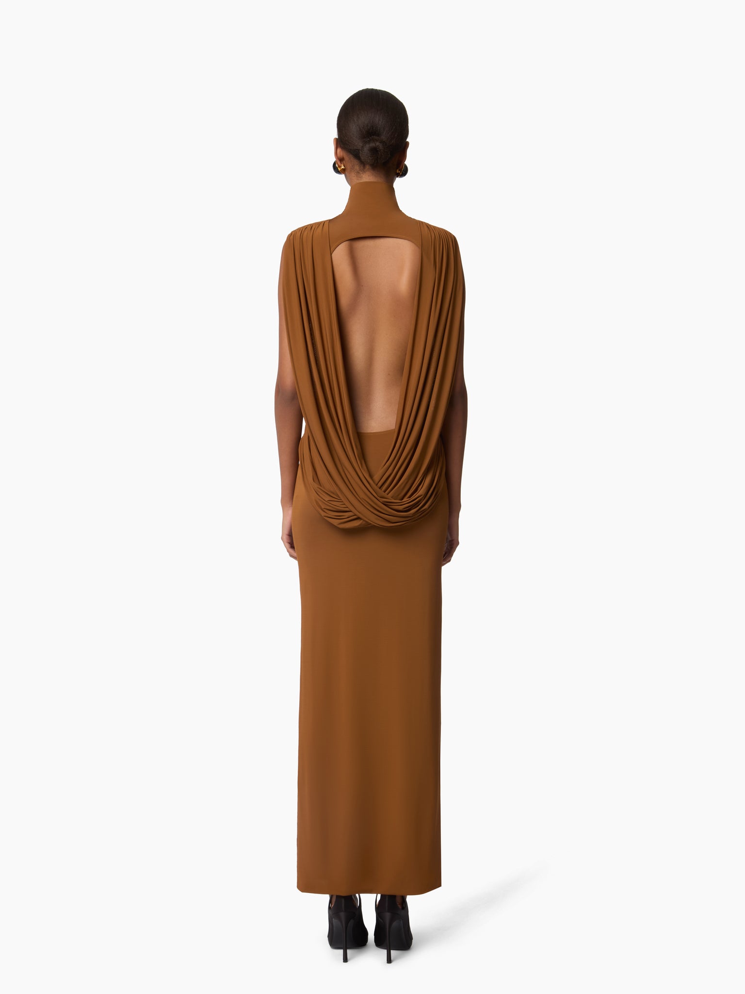 This sleeveless chocolate-hued jersey dress features a fluid, stretch construction, and a clean, sculpted silhouette. A high neckline contrasts with a dramatic low-cut back framed by elegant draping, while the play-on volume adds a contemporary twist to this timeless piece.
