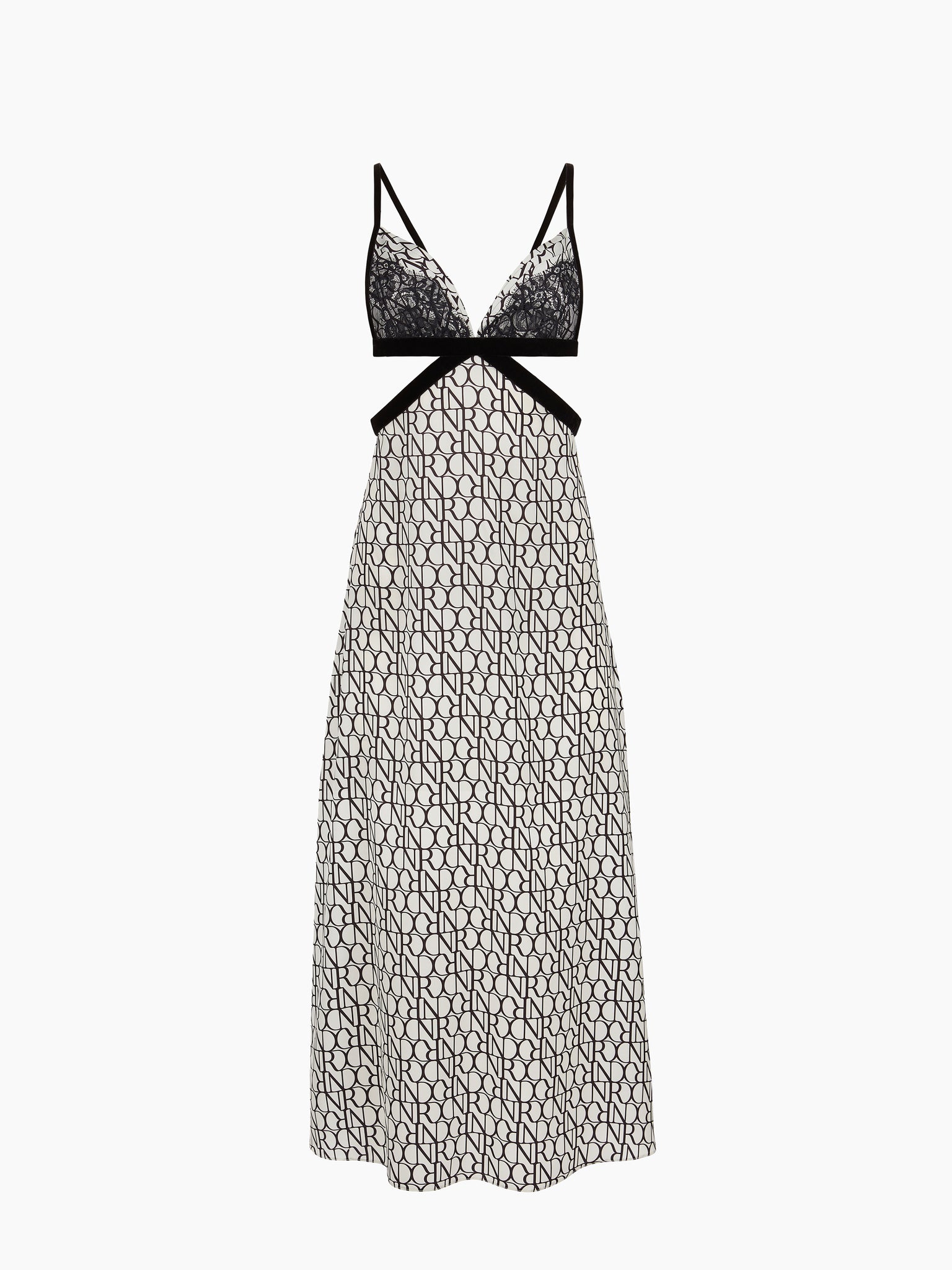 This midi dress with fine straps blends modernity and sensuality. Crafted from lightweight chiffon, it features the exclusive Nina Ricci logo print for the Autumn-Winter 2025 season. Its fitted silhouette is enhanced by a series of cut-outs that structure the waist, accentuated with black satin inserts. A delicate lace-trimmed V-neckline adds a romantic touch, creating a look that is both bold and refined.