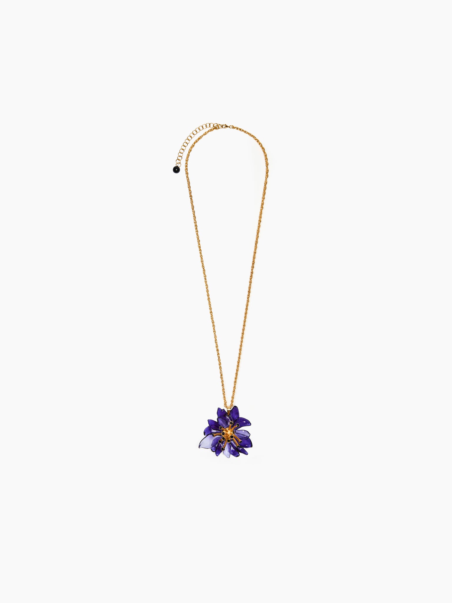 Suspended from a twisted gold-tone chain, the "Pistil Bloom" necklace features a sculptural flower pendant in deep violet tones. Delicately translucent petals encircle a golden pistil, playing with light and shadow in motion.