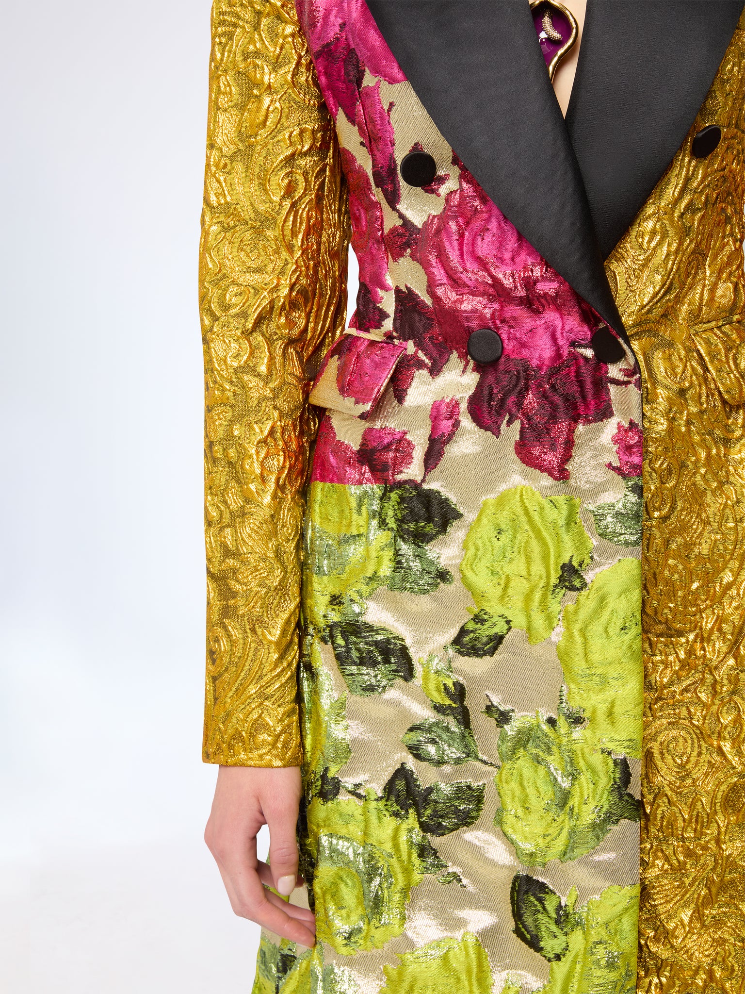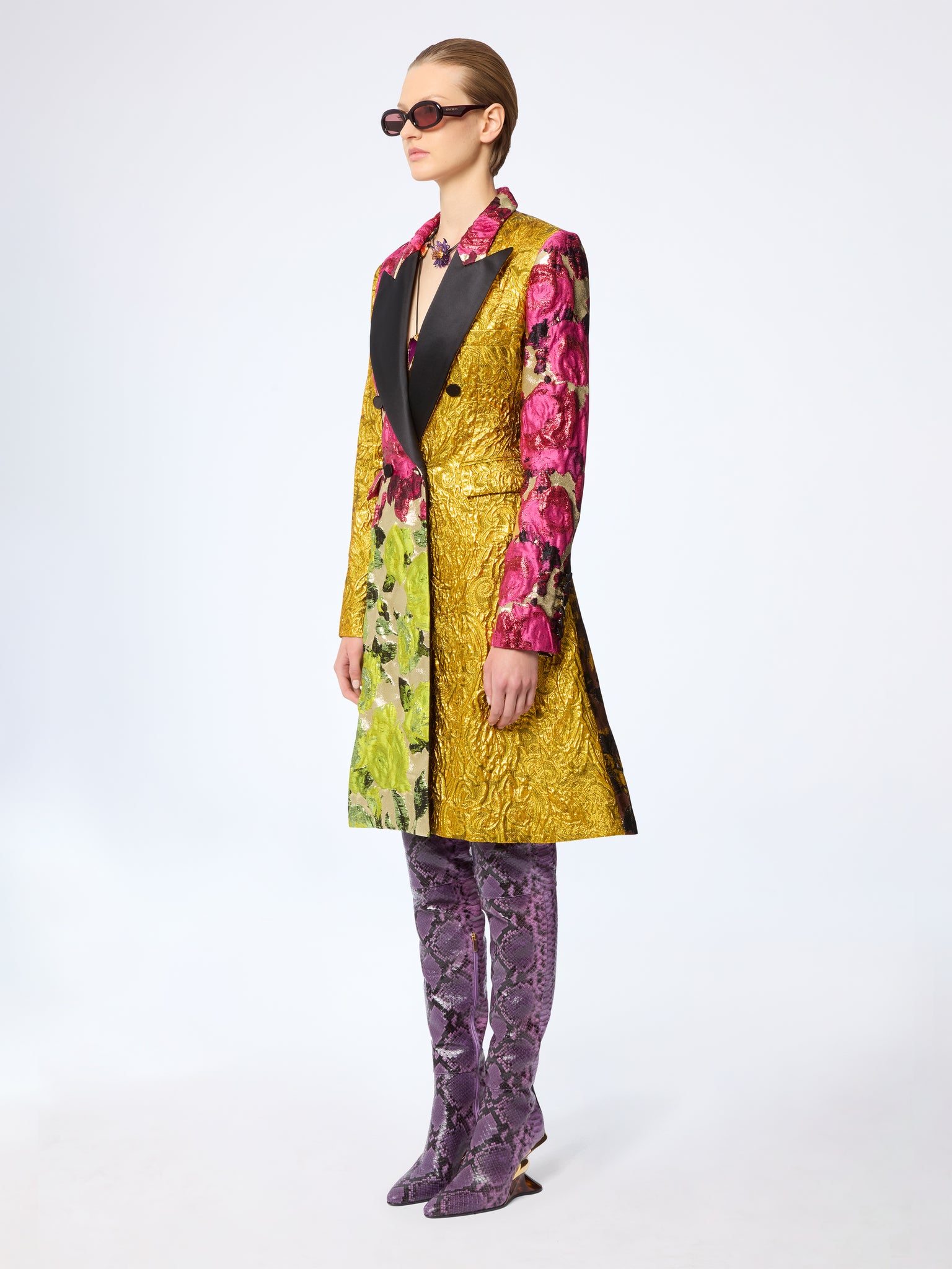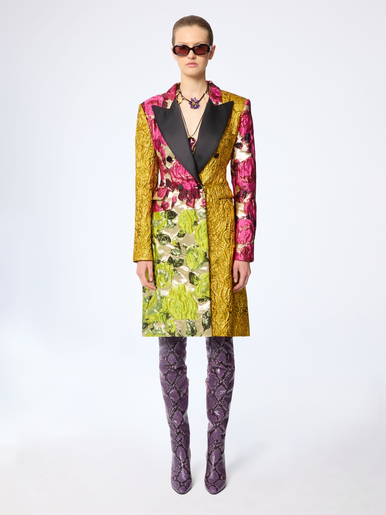 Esta levita de jacquard con patchwork forma parte de la colección Primavera-Verano 2026 y combina la complejidad de las superficies con la precisión de la sastrería. Su silueta escultural está construida a partir de jacquards florales en tonos contrastantes (rosa, dorado, verde) enmarcados por una elegante solapa de satén negro.