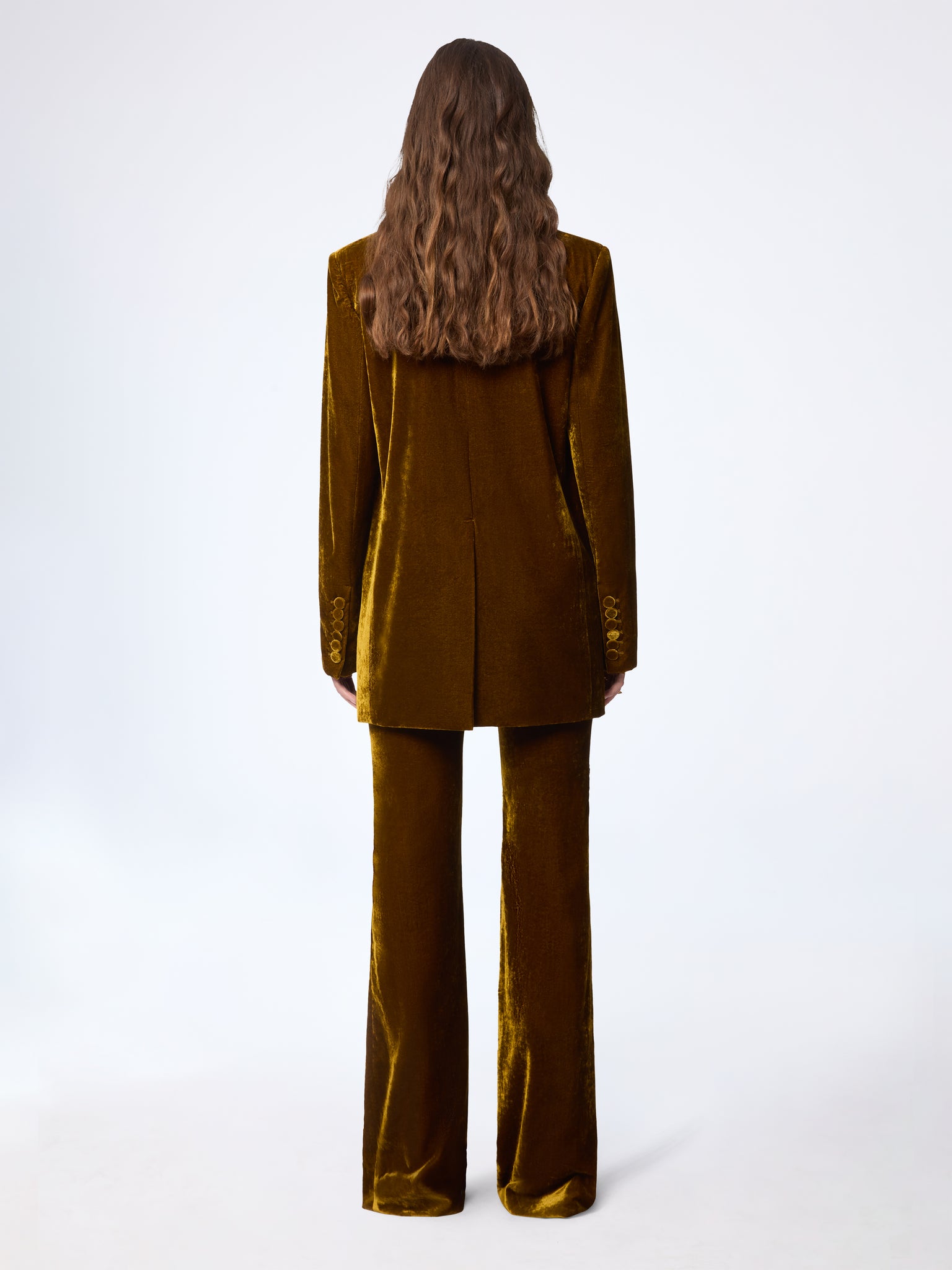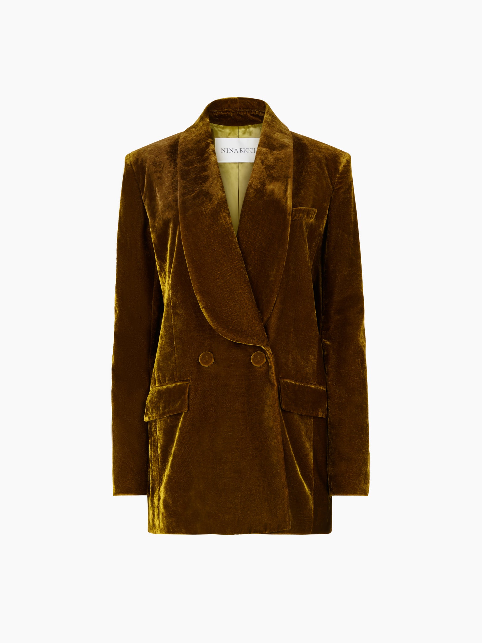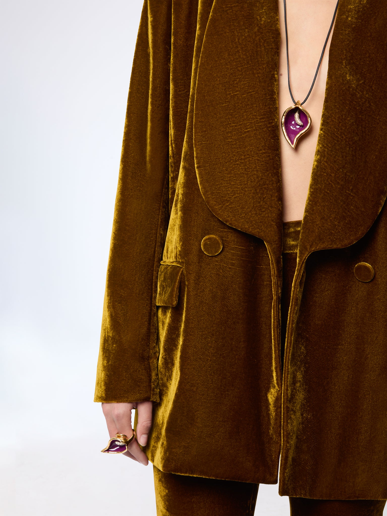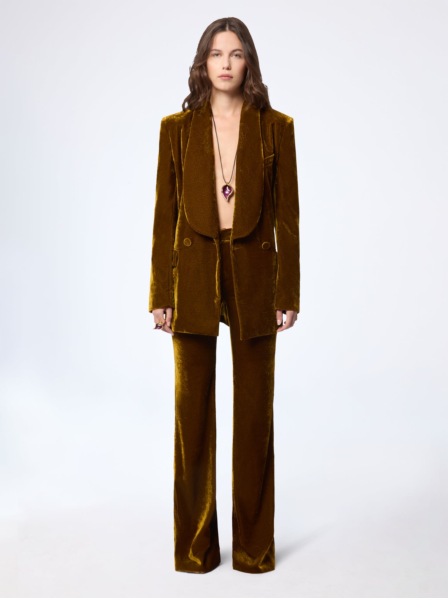 Este blazer de terciopelo con doble botonadura reinventa la sastrería estructurada con suavidad visual. El tejido afelpado capta la luz con profundidad e intensidad, realzando las líneas limpias de la silueta, desde el amplio cuello chal hasta los bolsillos con solapa y el corte alargado.