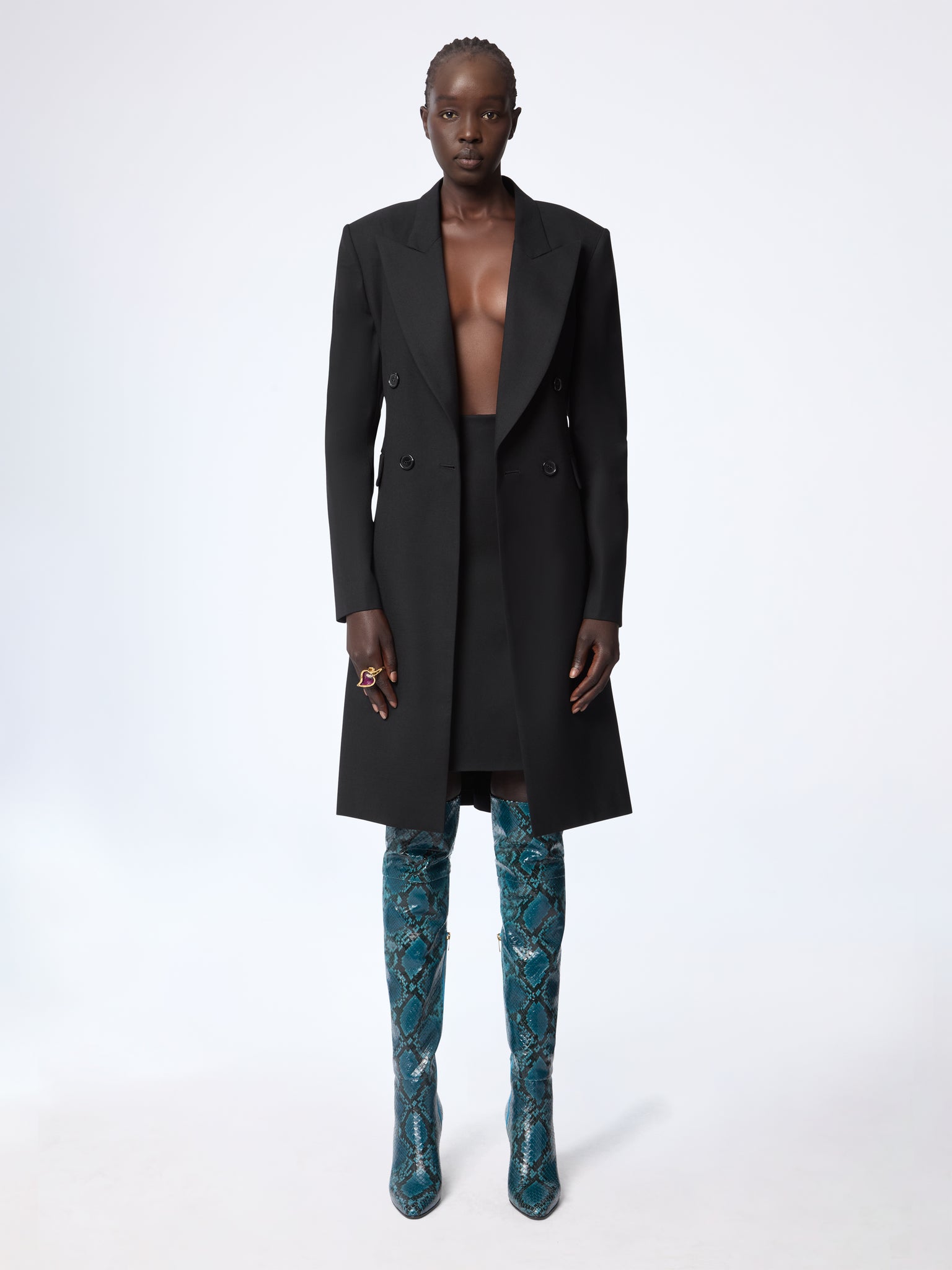 Confeccionada en gabardina de lana negra, esta levita pertenece a la colección Primavera-Verano 2026. Su silueta alargada con doble botonadura está esculpida con precisión y presenta hombros marcados, solapas de pico y bolsillos con solapa. El corte estructurado realza la cintura, ofreciendo presencia y aplomo en cada gesto.