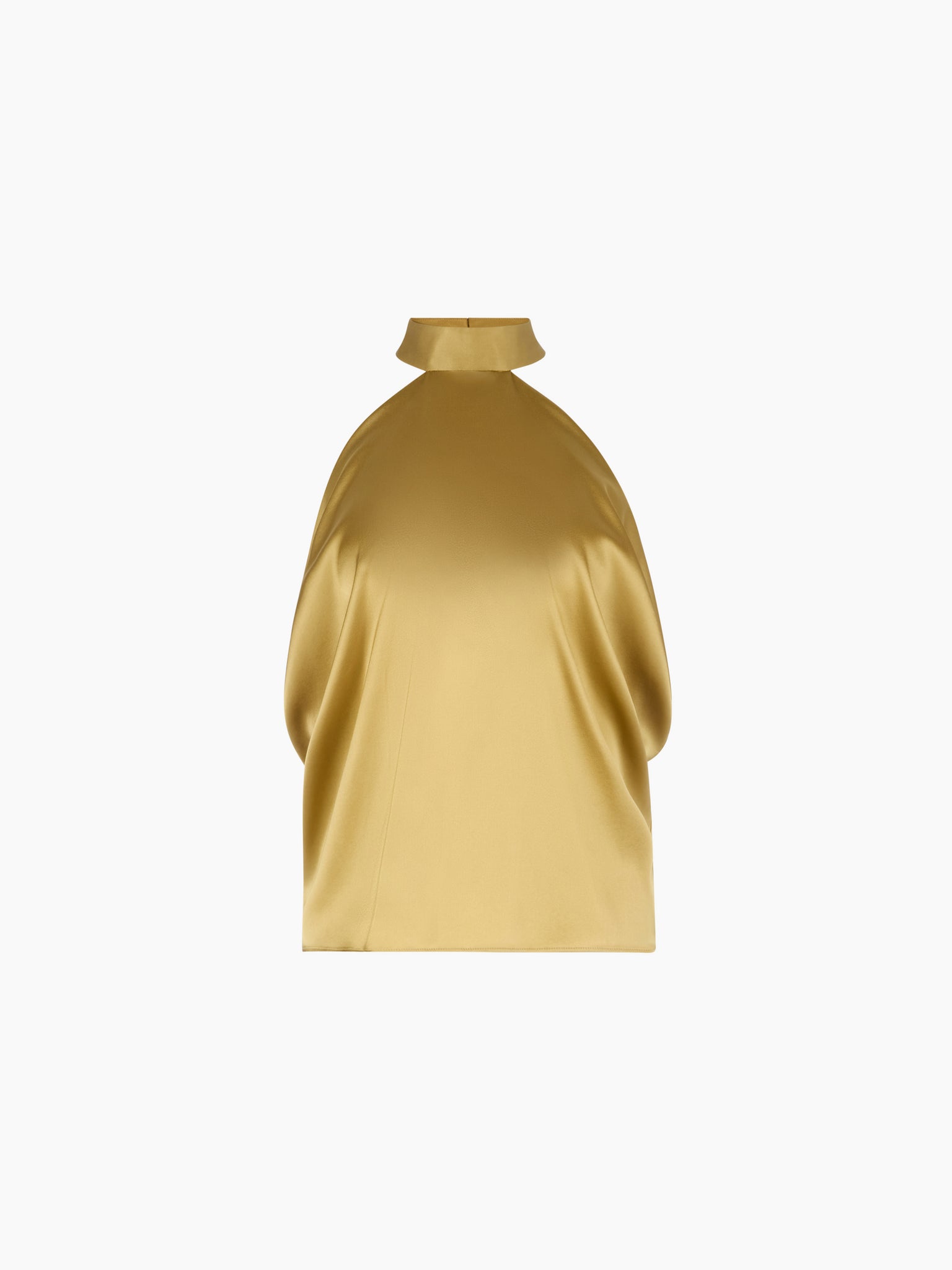 Este top con cuello halter de satén de seda dorado destaca por su fluida elegancia y su atrevida silueta. La espalda abierta revela la piel con refinada sutileza, perfecta para un look de noche discreto y a la vez atrevido.