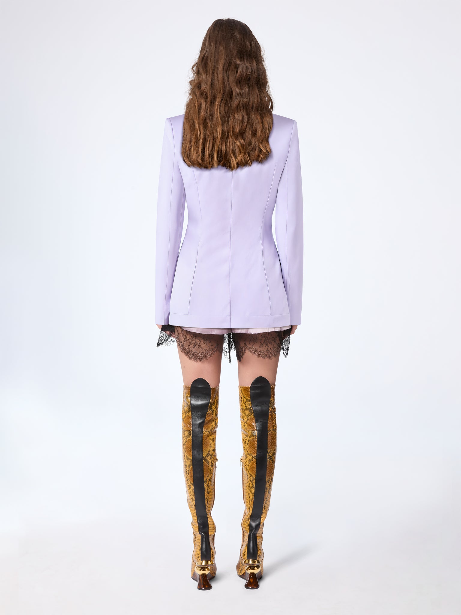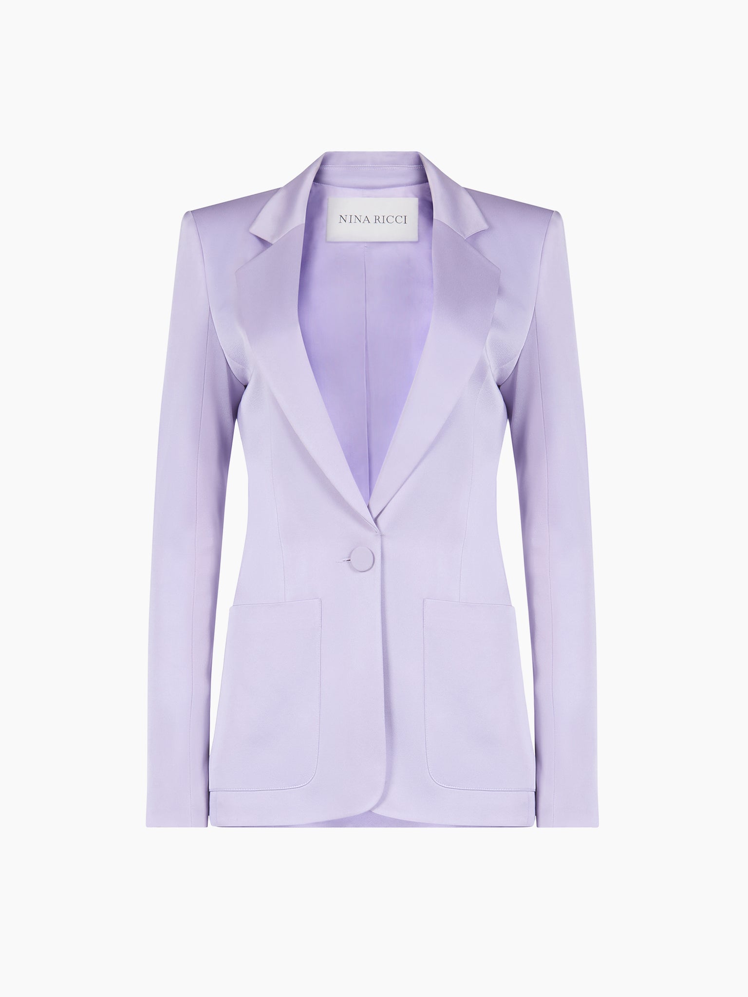 Este blazer confeccionado en satén de crepé lila presenta un elegante corte entallado con hombros redondeados y un frente de un solo botón. Desarrollado para la colección Primavera-Verano 2026, juega con la luz y la suavidad manteniendo una línea alargada y definida.