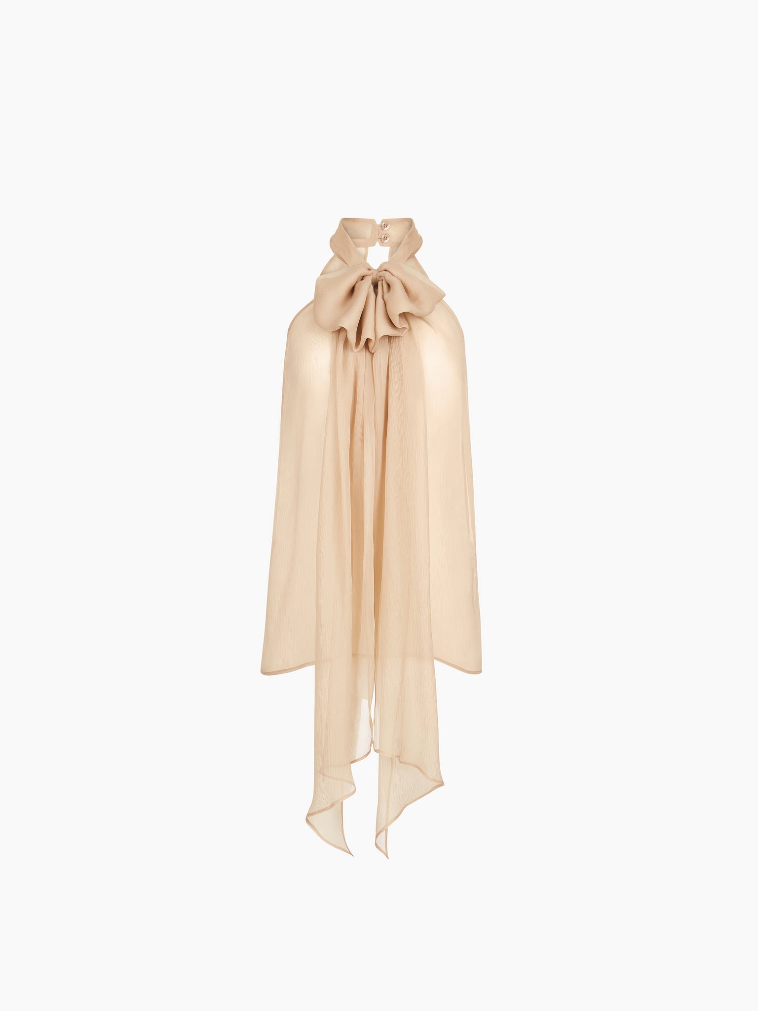 Este tope halternalk en la muselina de seda arrugada con su elegancia sin peso y silueta audaz. Está elevado por una larga bufanda Lavalliere que puede atarse o dejar que fluya libremente. La espalda abierta revela el cuerpo con sutil sensualidad, por lo que es la elección perfecta para un aspecto nocturno con encanto y confianza discretos.