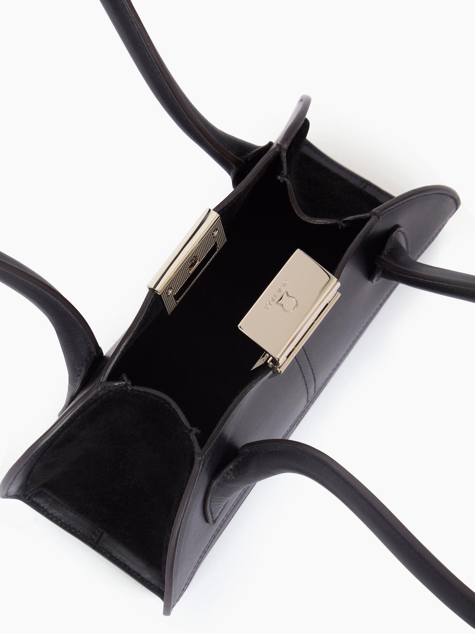 Le Le Bal Bag Mini affirme son caractère dans un format miniature au style audacieux. Confectionné en cuir de veau lisse noir et doublé cuir velouté, ce modèle se ferme par un fermoir à rabat aimanté doré.