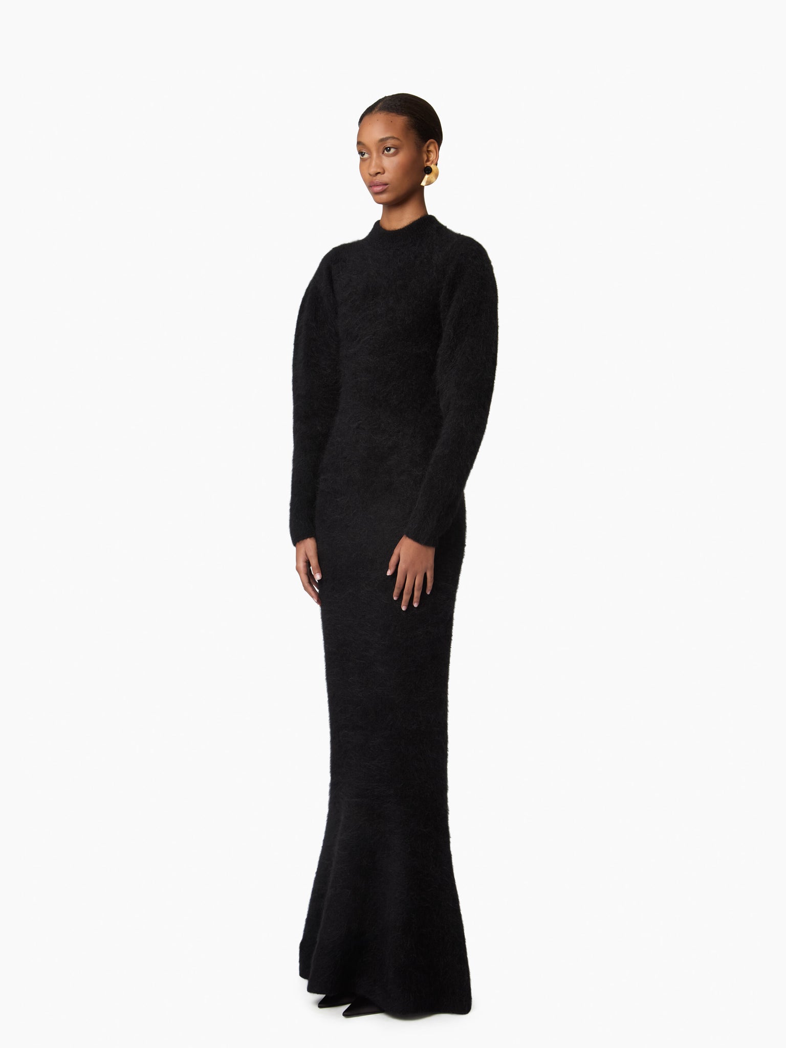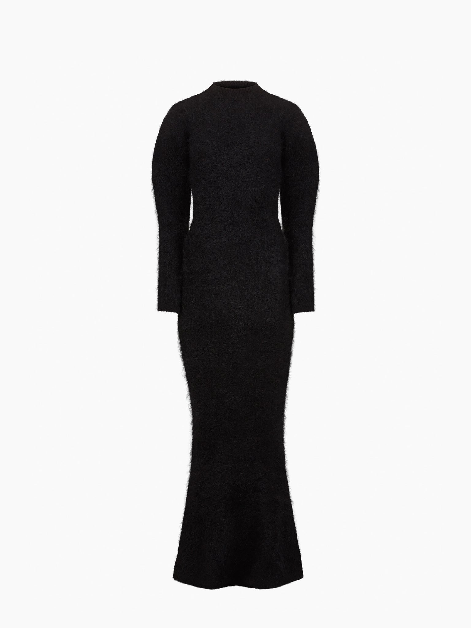Cette robe longue noire à manches longues est confectionnée dans une maille brossée ajustée, idéale pour l’hiver. Dotée d’un col rond et d’une coupe fuselée, elle épouse la silhouette et allonge la ligne pour une allure élégante et minimaliste.