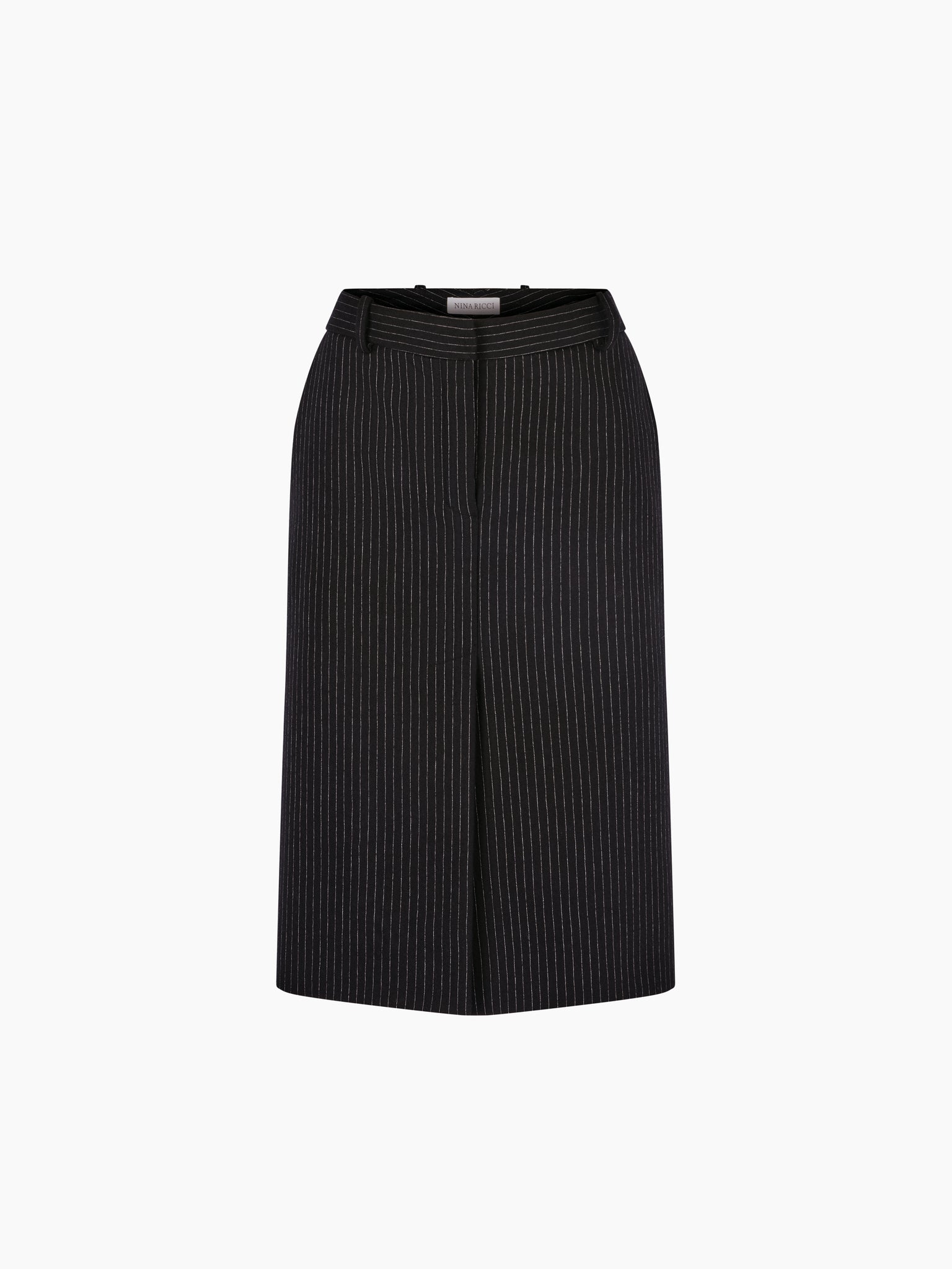 Issue de la collection Printemps-Été 2026, cette jupe rayée en laine vierge revisite les codes du tailoring masculin avec une touche résolument féminine. Sa silhouette midi épurée, travaillée dans une matière structurée, présente un pli devant et des lignes précises qui évoquent l’esprit du tailleur. Portée avec le blazer assorti ou associée à des pièces laissant subtilement apparaître la peau, elle incarne l’élégance affirmée propre à la vision de Harris Reed pour Nina Ricci.