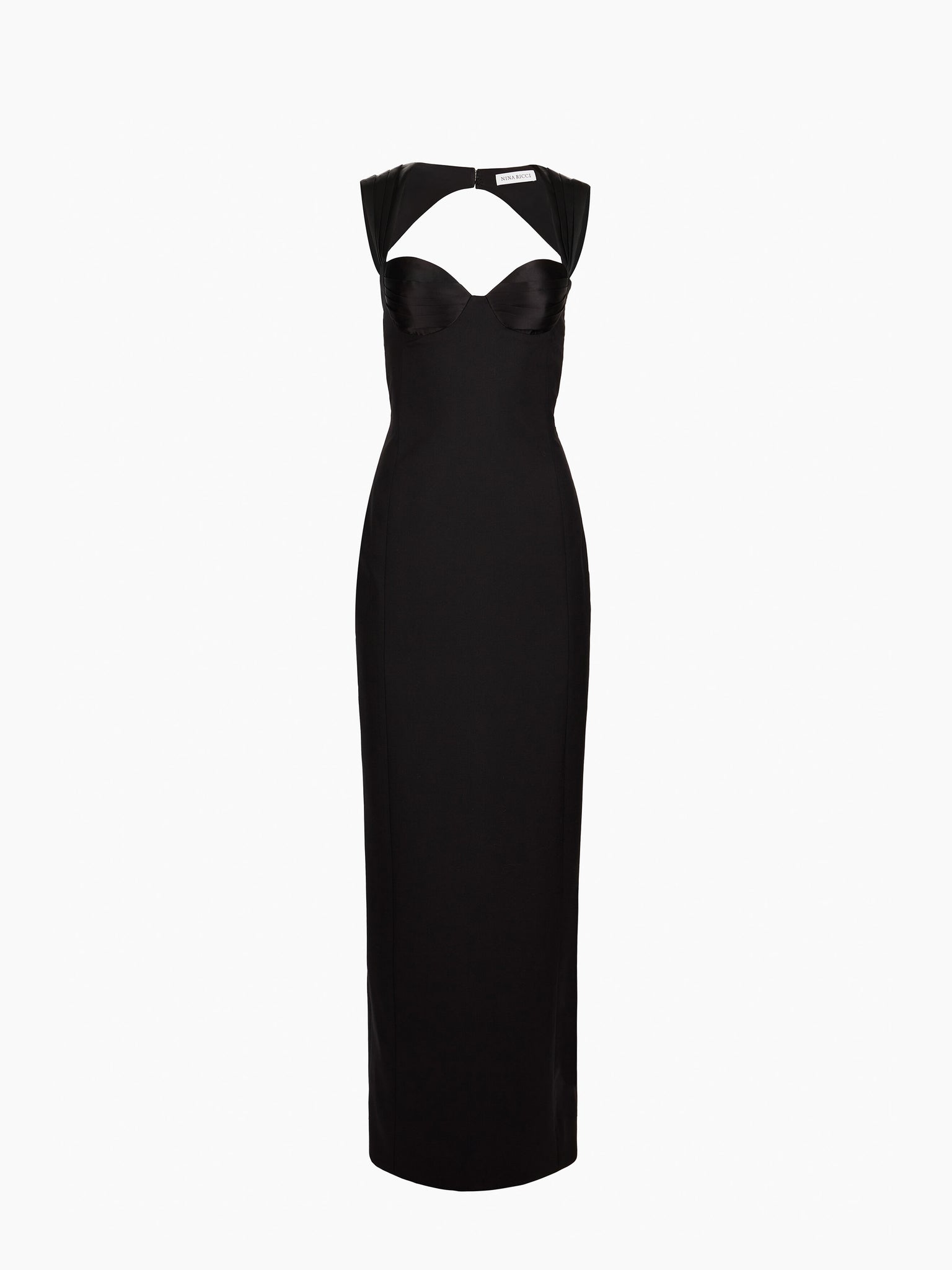 Cette robe longue noire sans manches est confectionnée en gabardine de laine, et structurée par un bustier en satin au décolleté cœur. Elle dévoile un dos nu graphique, ponctué d’une découpe centrale et d’un jeu de bandes croisées pour rappeler le nœud cher à la maison Nina Ricci. Une pièce élégante et audacieuse, pensée pour les grandes occasions.