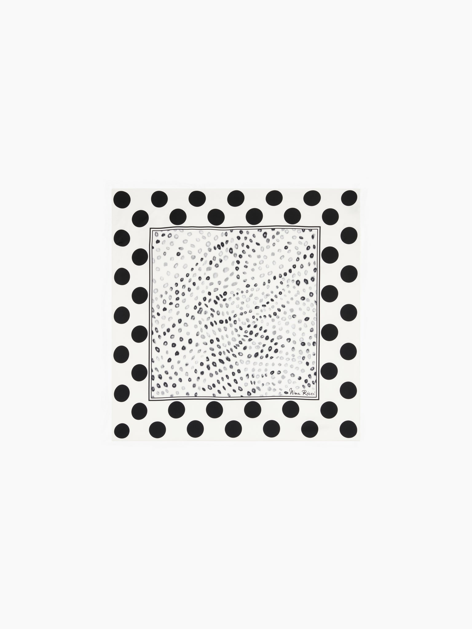 Confectionné en pure soie, ce foulard carré révèle une composition dynamique de pois noirs et blancs. Au centre, un tourbillon de petits pois crée un mouvement visuel subtil, encadré par une bordure large et audacieuse qui réinterprète l’un des motifs signatures de Nina Ricci à travers le jeu du contraste et du rythme.