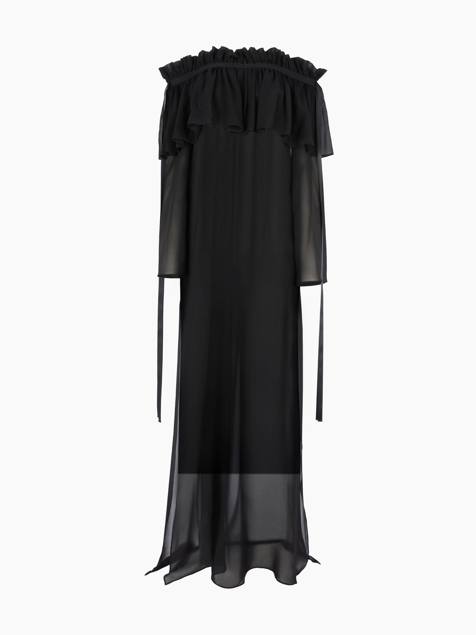 Cette robe longue en soie noire, portée sur les épaules dénudées, est une pièce phare de la collection Printemps-Été 2026. Elle marie un volume théâtral à une transparence délicate pour créer une présence spectaculaire. L’encolure volantée est maintenue par de fines bretelles nouées, ajoutant une touche de féminité irrévérencieuse à cette silhouette dramatique conçue pour accompagner le mouvement du crépuscule à l’aube.