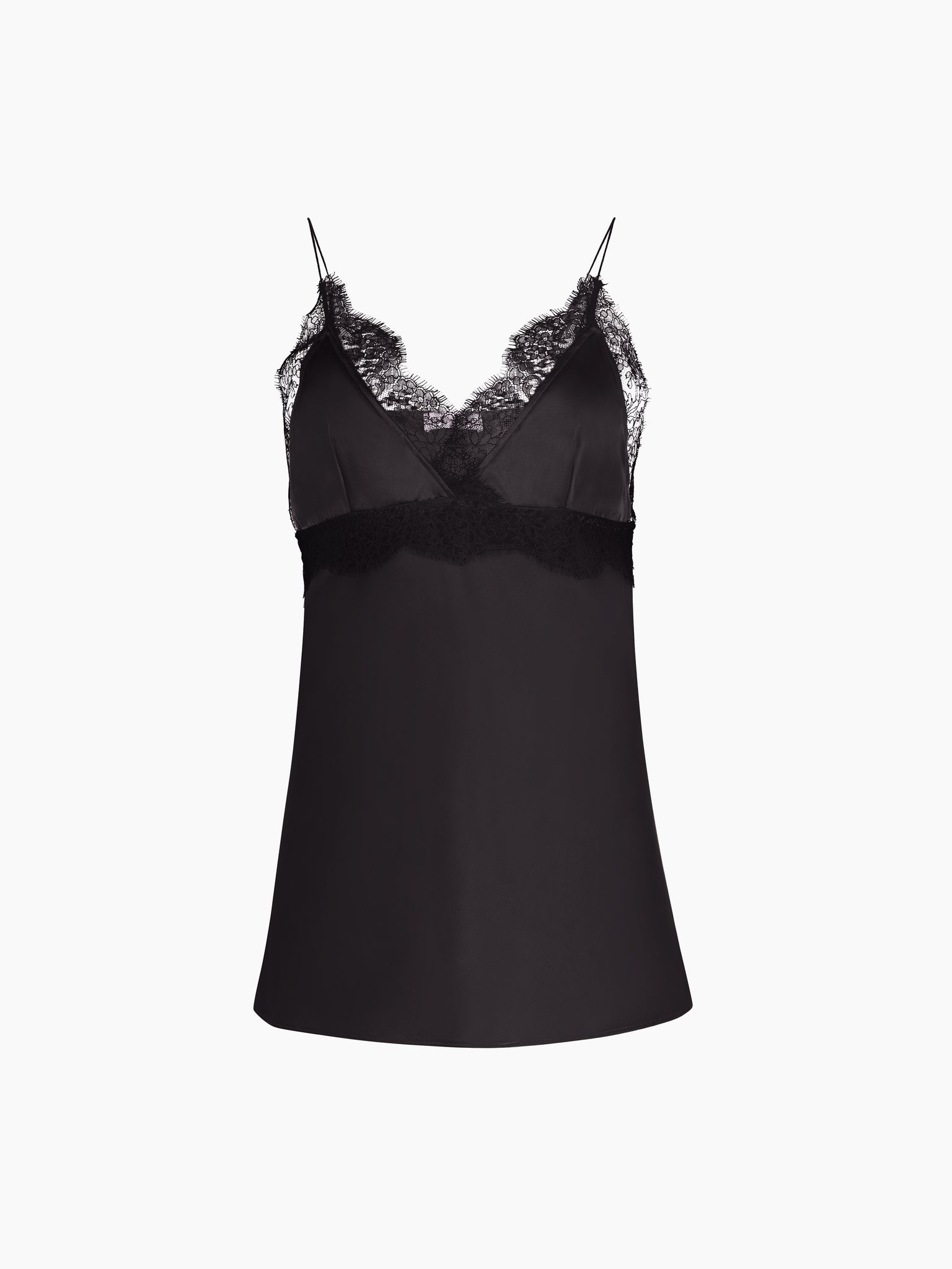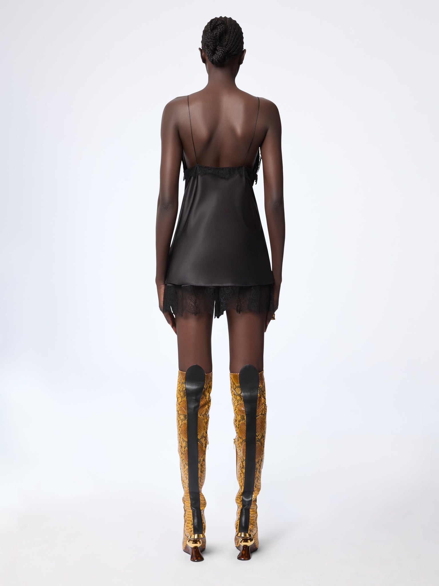 Célébration de la fluidité sensuelle, ce haut en satin de soie noir présente un décolleté en V profond encadré par une dentelle délicate. La silhouette inspirée de la lingerie contraste douceur et structure, superposant la lumière contre l'ombre. Conçu pour la collection Printemps-Été 2026, il reflète la redéfinition de la féminité de Harris Reed à Nina Ricci