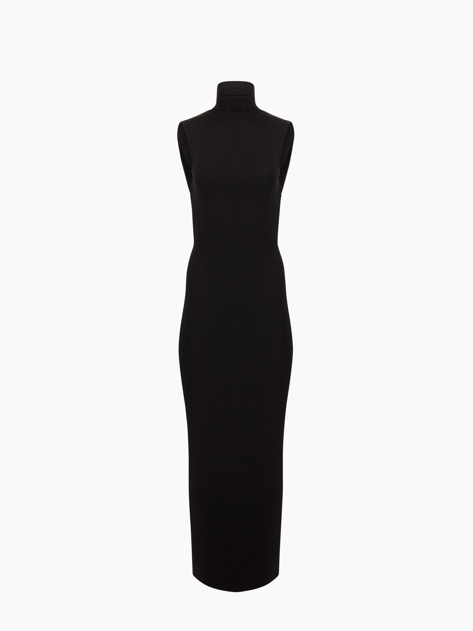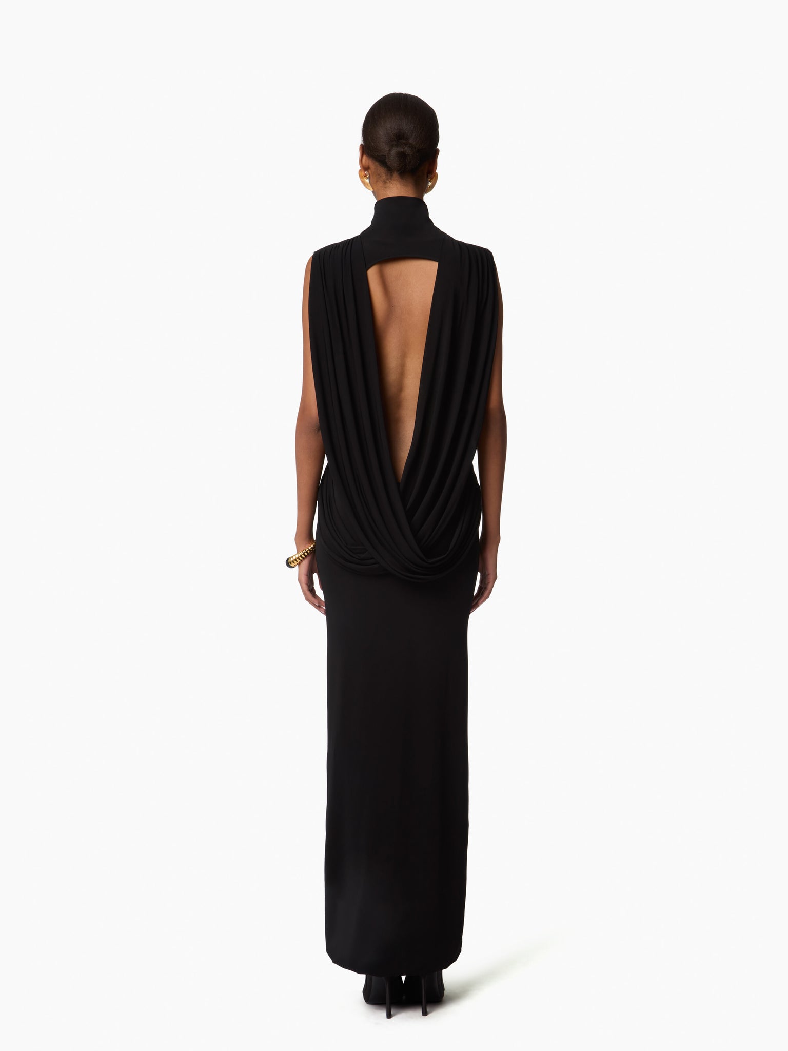 Cette robe couleur chocolat mi-longue sans manches, confectionnée en jersey fluide et stretch, se distingue par son col montant, son dos nu encadré de drapés élégants et sa silhouette épurée. Son jeu de volumes apporte une touche de modernité à cette pièce intemporelle.