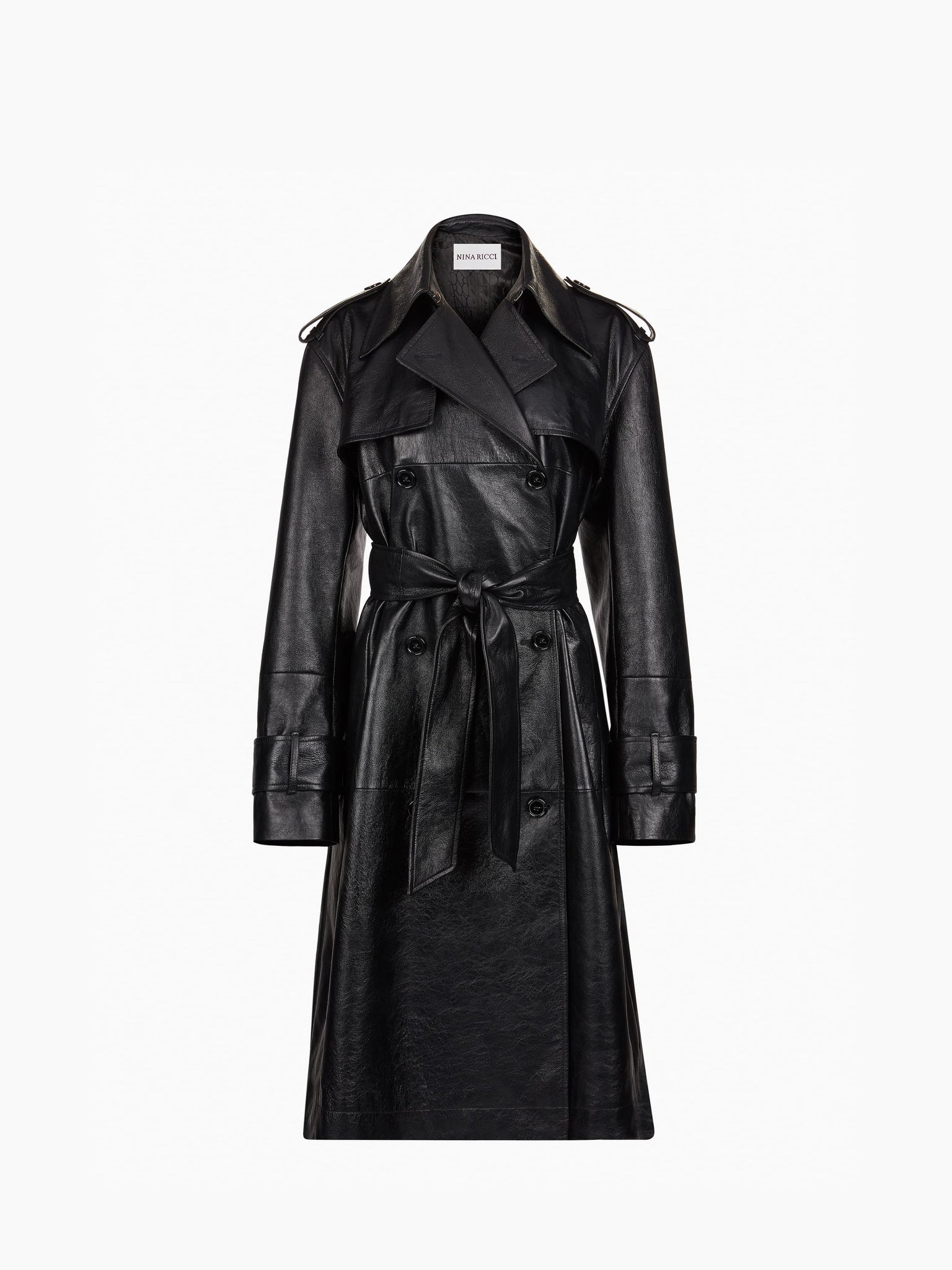 ワードローブの古典と主食 Nina Ricci コレクション、トレンチコートは今シーズン、しわくれた黒い革で再考され、腰に合わせて洗練された構造化されたシルエットのためのマッチングベルトと結び付けられています。