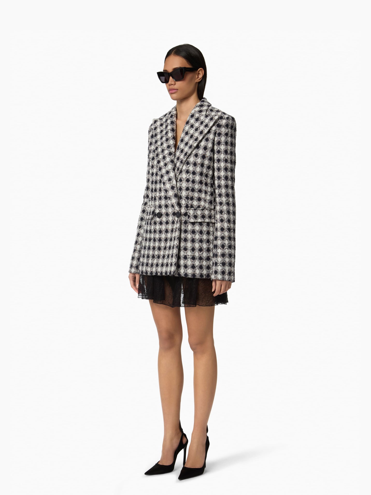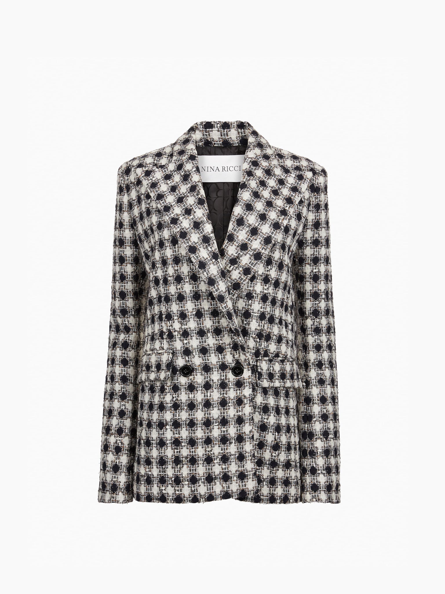 微妙なきらめきのあるこのクリームと黒いツイードブレザーは、調整の精度と純度を再考します Nina Ricciのレンズ。その特大のカットは、シルエットにソフト構造をもたらします。鮮明なドレープのある生地で作られたこの秋冬2025コレクションのこの特徴的な作品は、女性らしいフォーマルウェアを大胆でモダンなテイクを提供します。