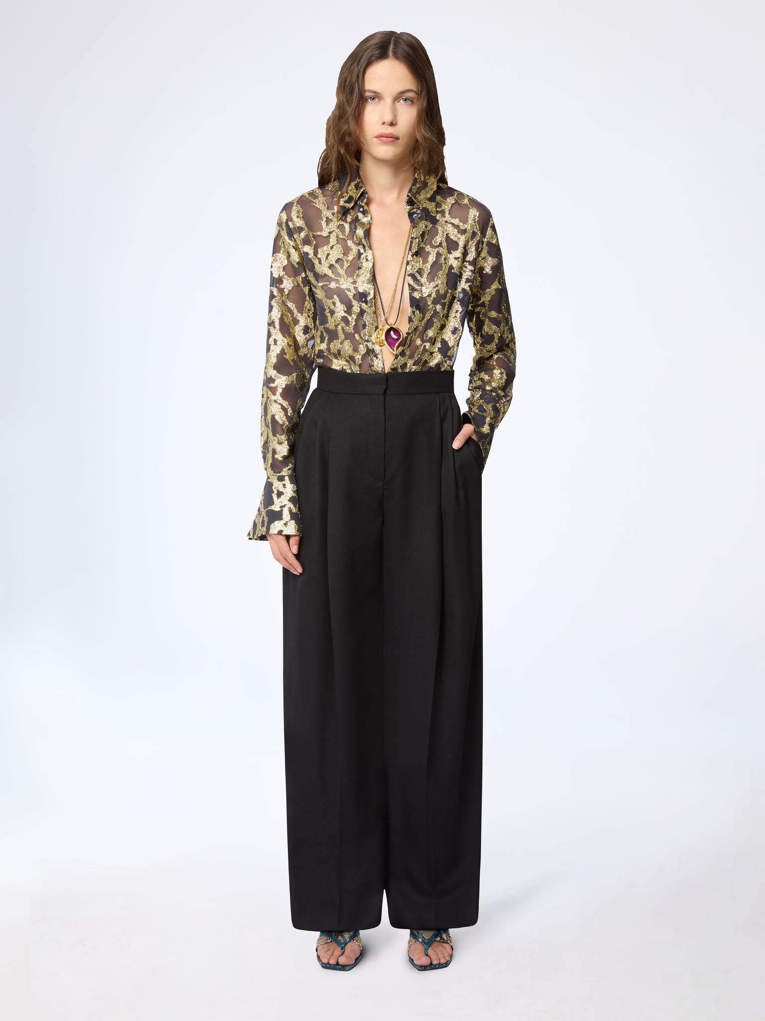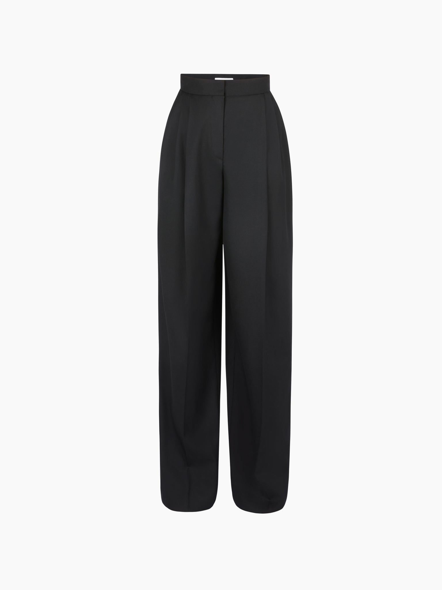 ブラックのウールギャバジンを使用したこれらのワイドレッグパンツは、仕立てられたハイウエストとシルエットを長く見せるフロントプリーツが特徴です。クリーンな構造と流れるようなドレープで、2026 年春夏コレクションの正確さを体現しています。